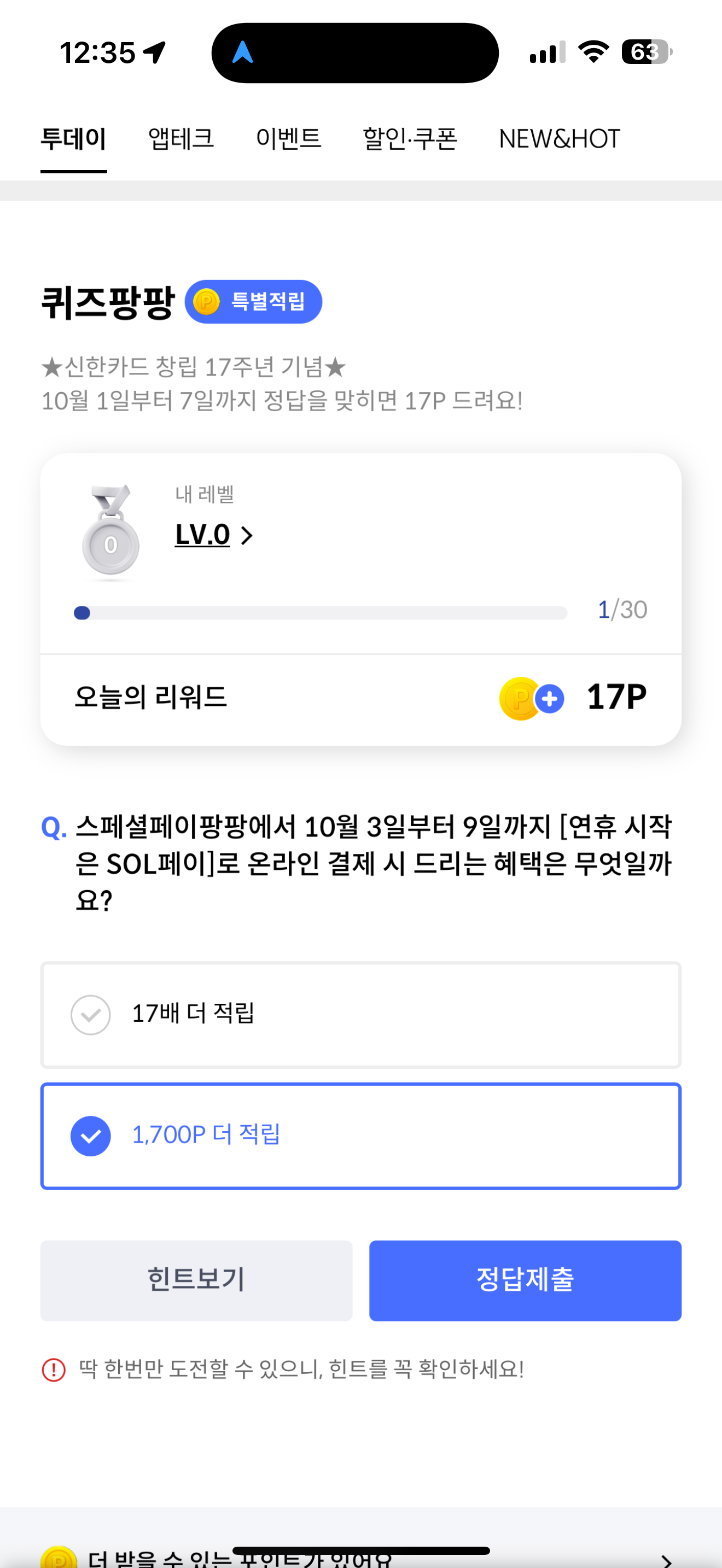 신한카드 퀴즈팡팡 정답은 1,700P 더 적립 입니다