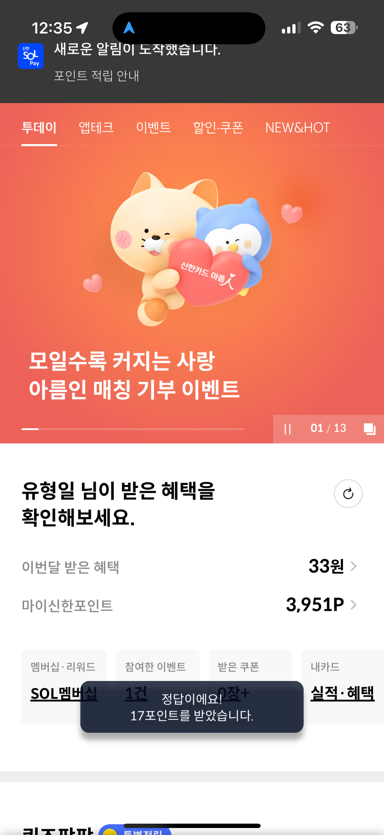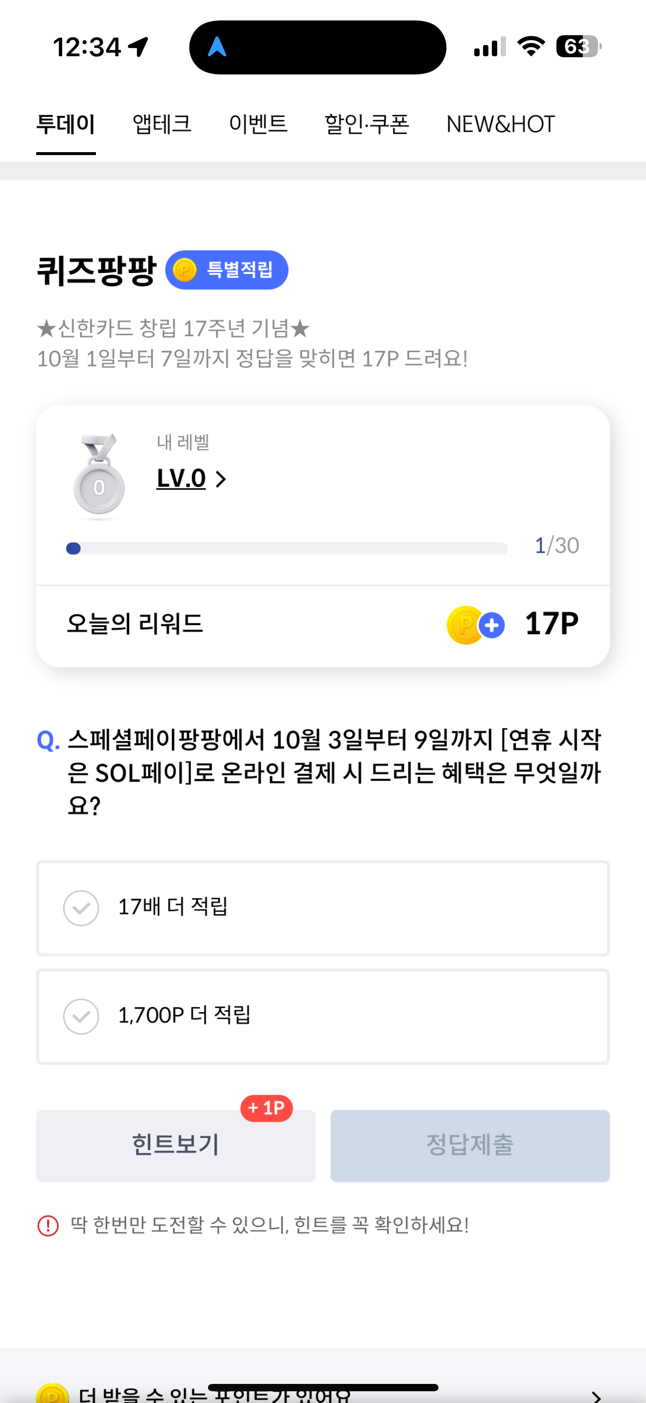 신한카드 퀴즈팡팡 정답은 1,700P 더 적립 입니다