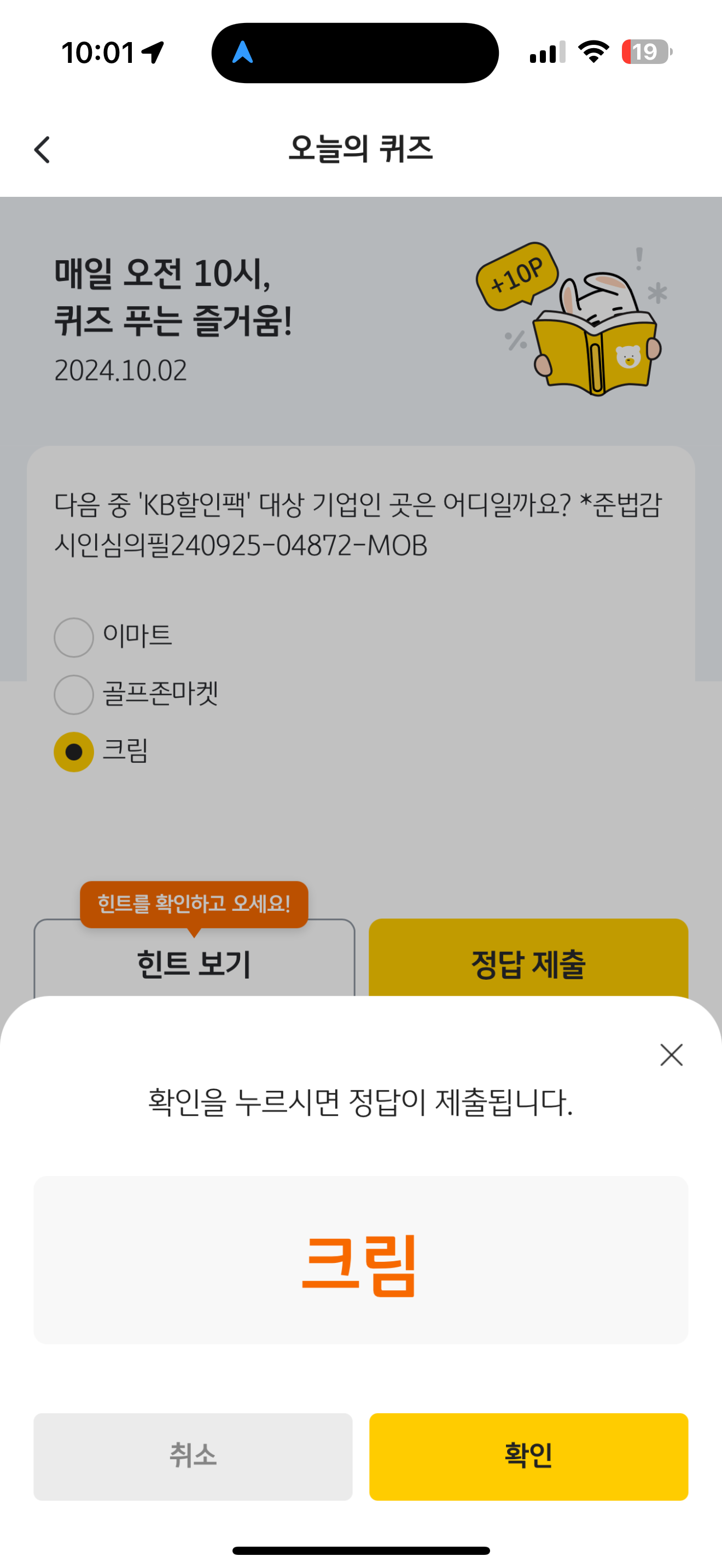 KB Pay 오늘의 퀴즈 정답은 크림 입니다