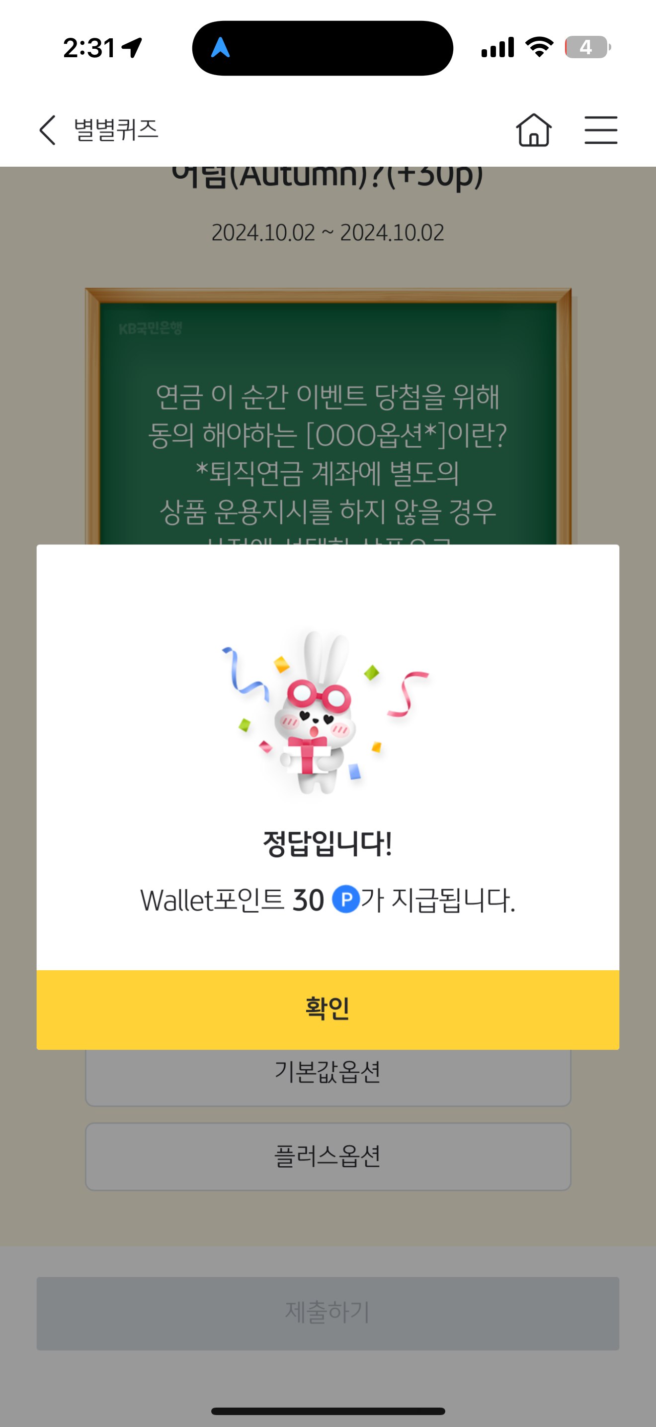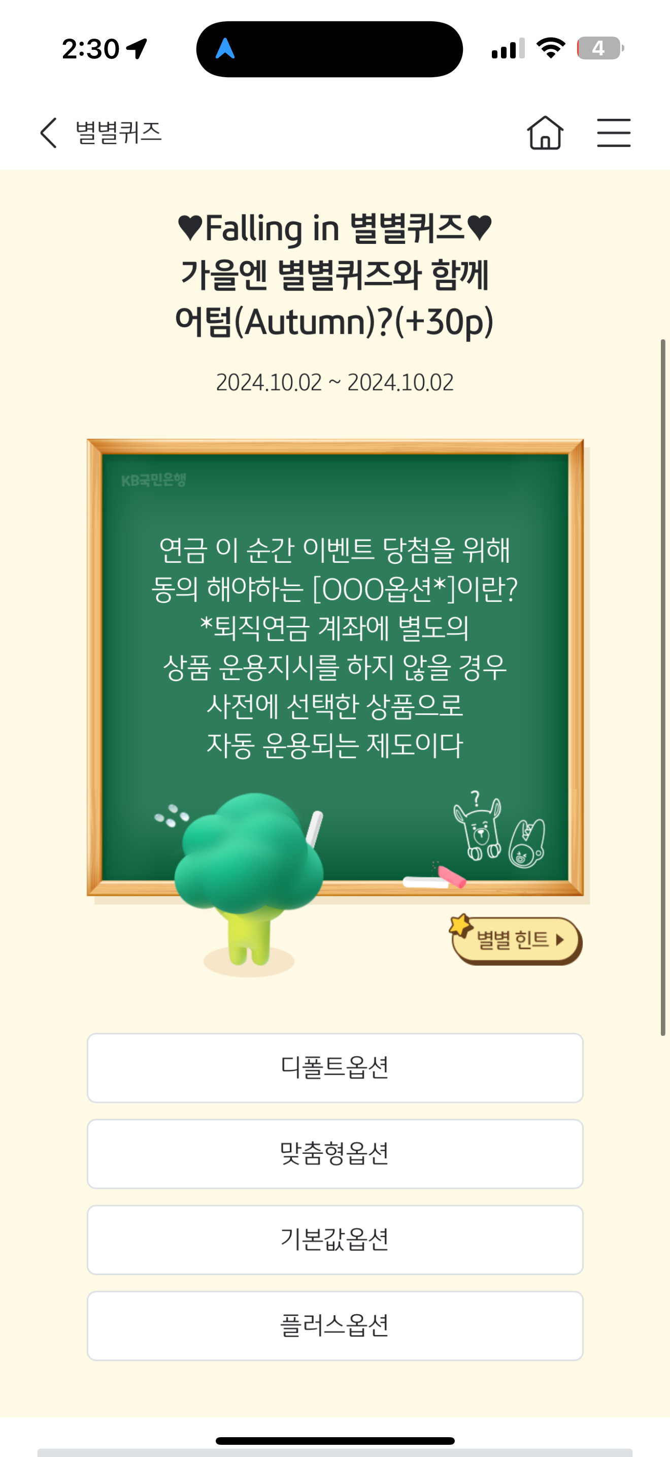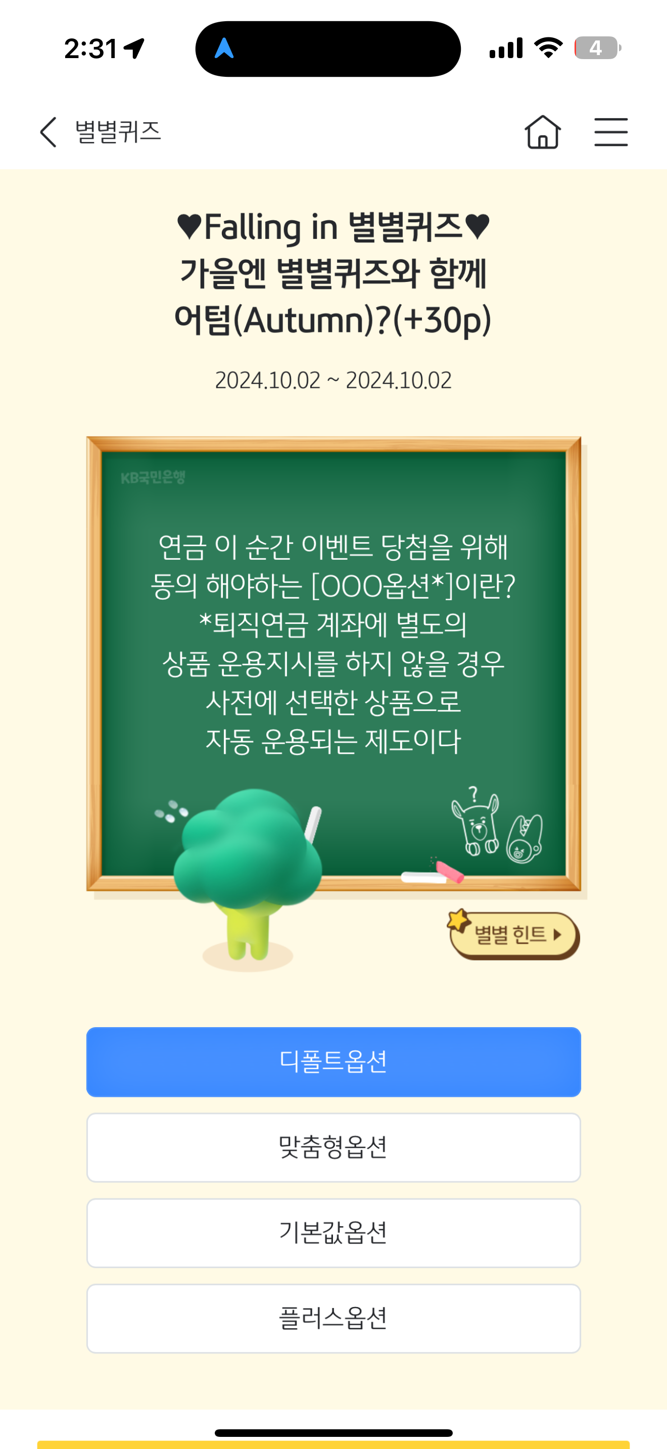 KB스타뱅킹 별별퀴즈 10월 2일 정답(연금 이 순간 이벤트 당첨을 위해 동의 해야하는 [OOO옵션*]이란? *퇴직연금 계좌에 별도의 상품 운용지시를 하지 않을 경우 사전에 선택한 상품으로 자동 운용되는 제도이다)