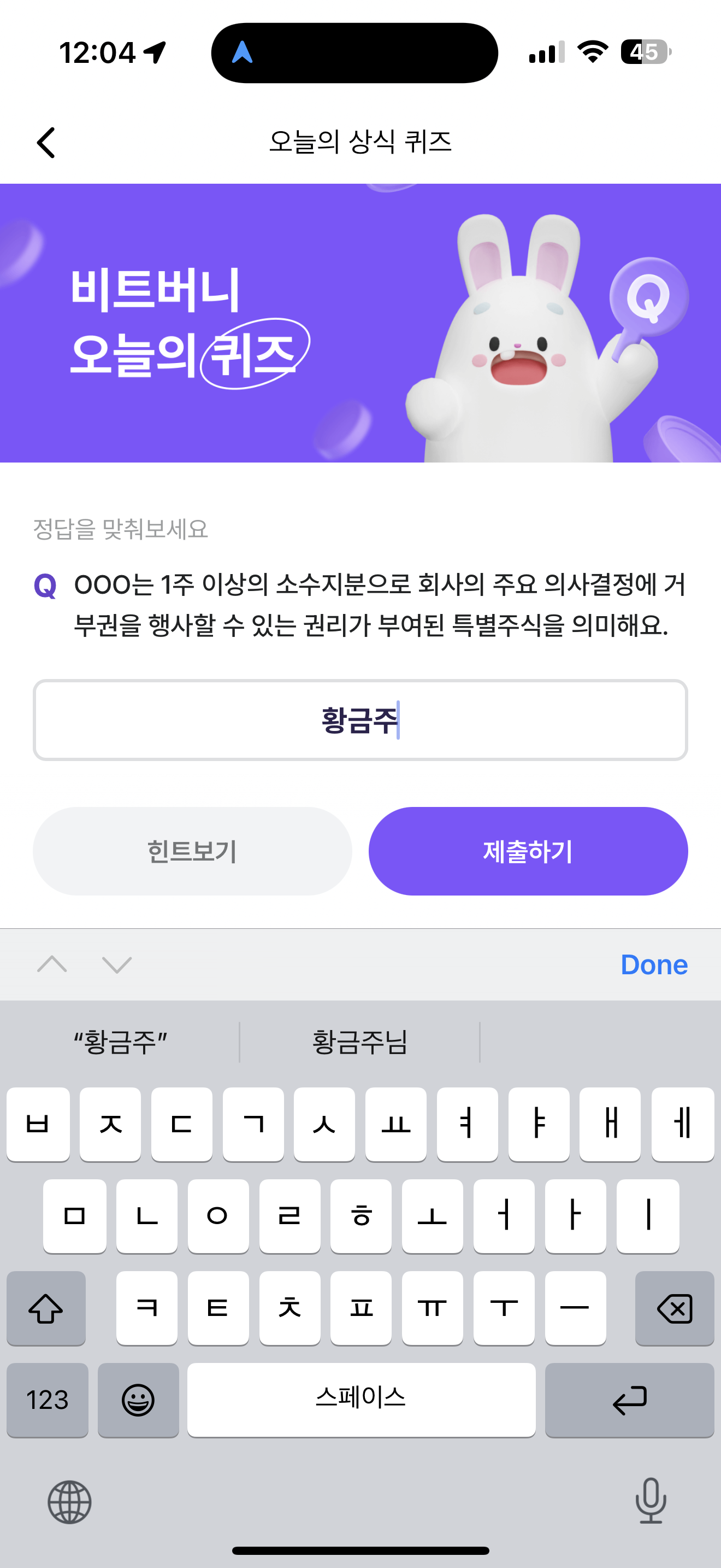 비트버니 오늘의 퀴즈 정답은 황금주 입니다