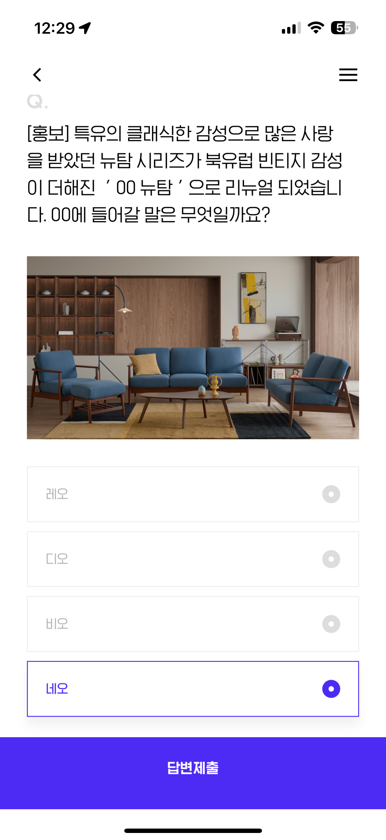 특유의 클래식한 감성으로 많은 사랑을 받았던 뉴탐 시리즈가 북유럽 빈티지 감성이 더해진 ' 00 뉴탐 ' 으로 리뉴얼 되었습니다. 00에 들어갈 말은 무엇일까요? 보기는 1. 레오 2. 디오 3. 비오 4. 네오 입니다. 북유럽 빈티지 감성이 예쁩니다. 확인해 보세요
