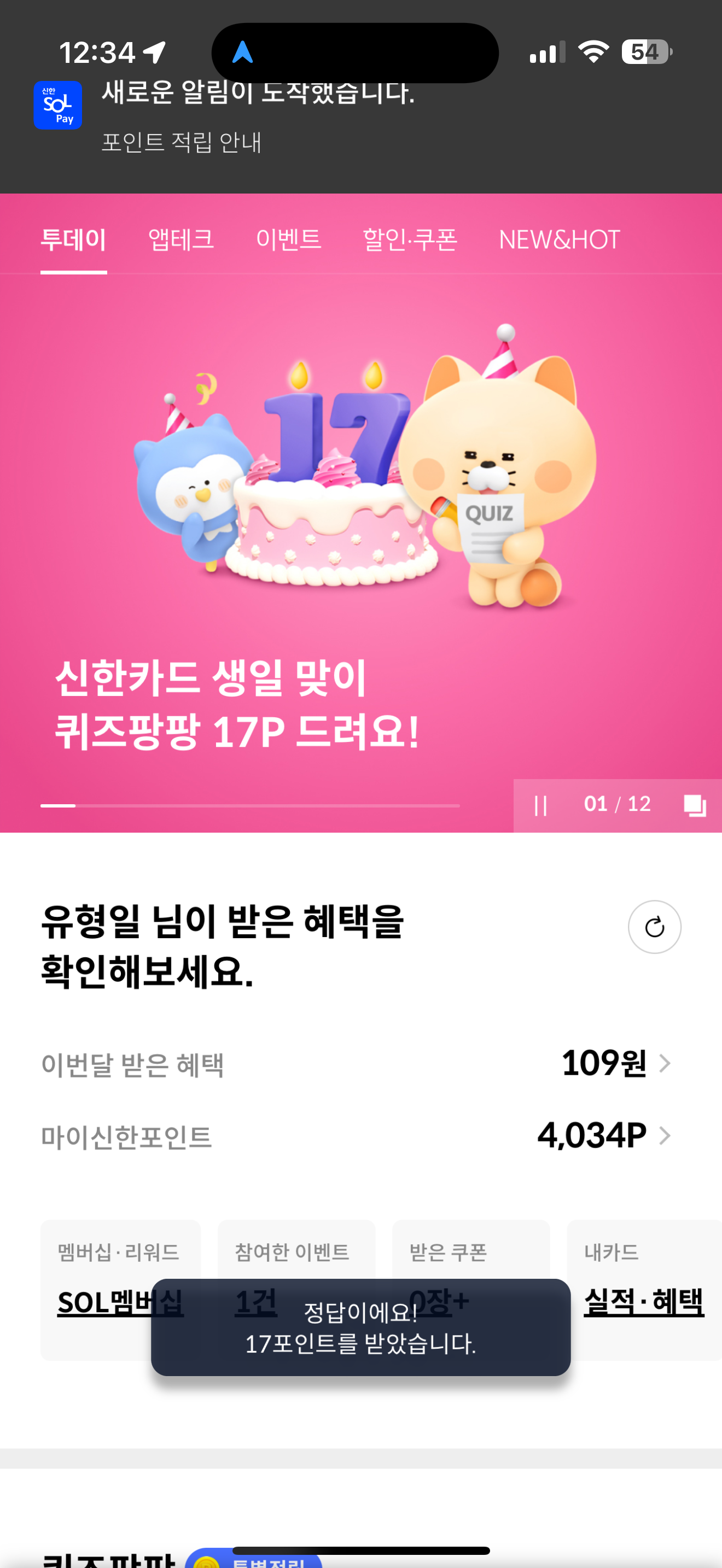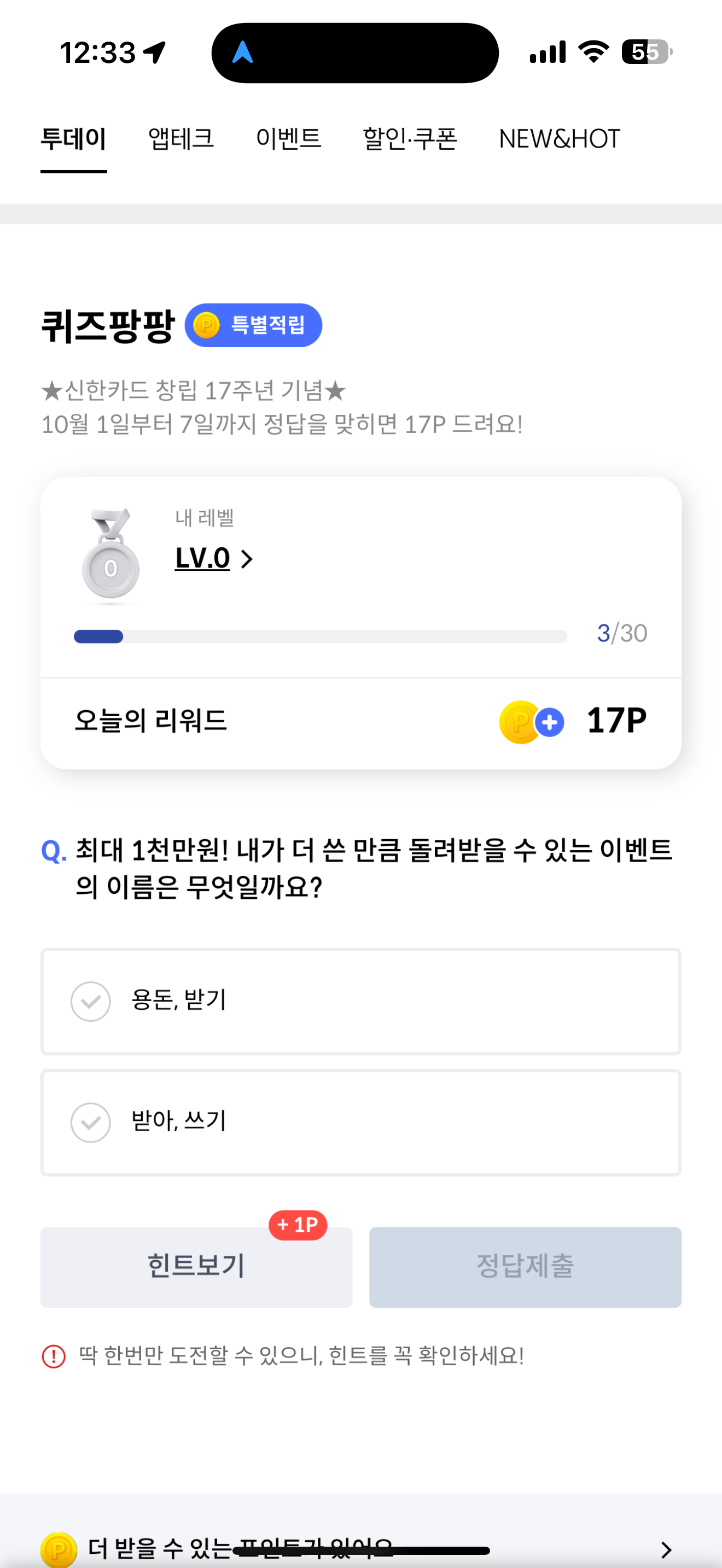 신한카드 퀴즈팡팡 정답은 받아, 쓰기 입니다