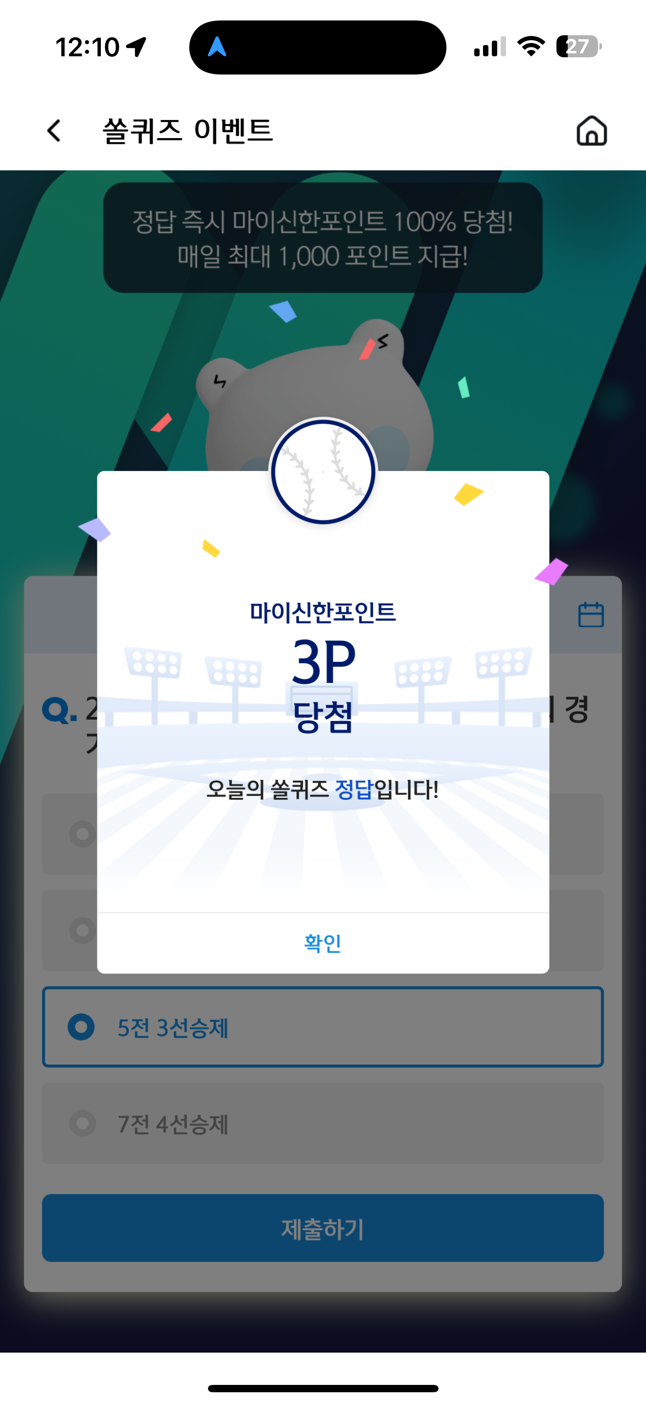 신한 슈퍼SOL 야구/상식 쏠퀴즈 정답은 5전 3선승제 입니다