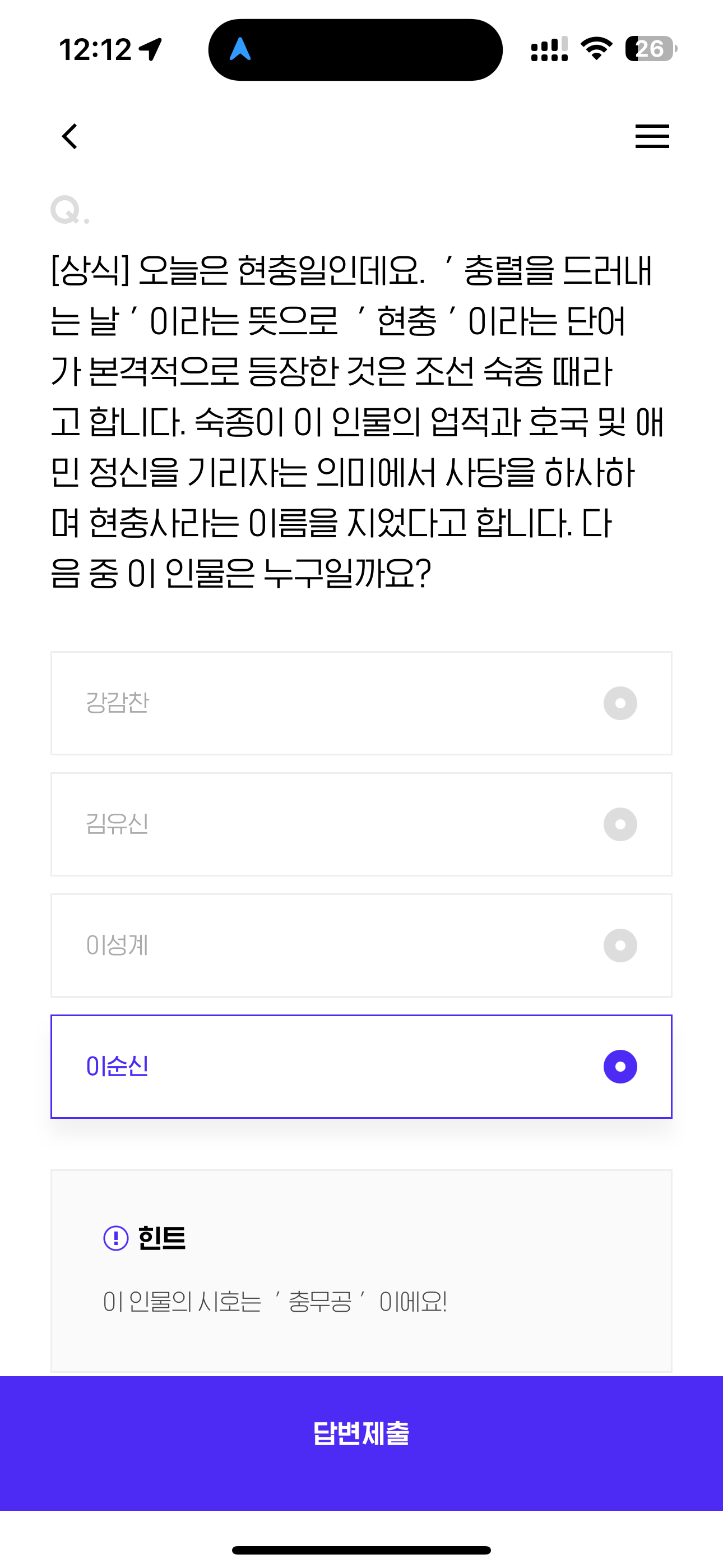 [상식] 오늘은 현충일인데요. ' 충렬을 드러내는 날 ' 이라는 뜻으로 ' 현충 ' 이라는 단어가 본격적으로 등장한 것은 조석 숙종 때라고 합니다. 숙종이 이 인물의 업적과 호국 및 애민 정신을 기리자는 의미에서 사당을 하사하며 현충사라는 이름을 지었다고 합니다. 다음 중 이 인물은 누구일까요? 보기는 1. 강감찬 2. 김유신 3. 이성계 4. 이순신 입니다