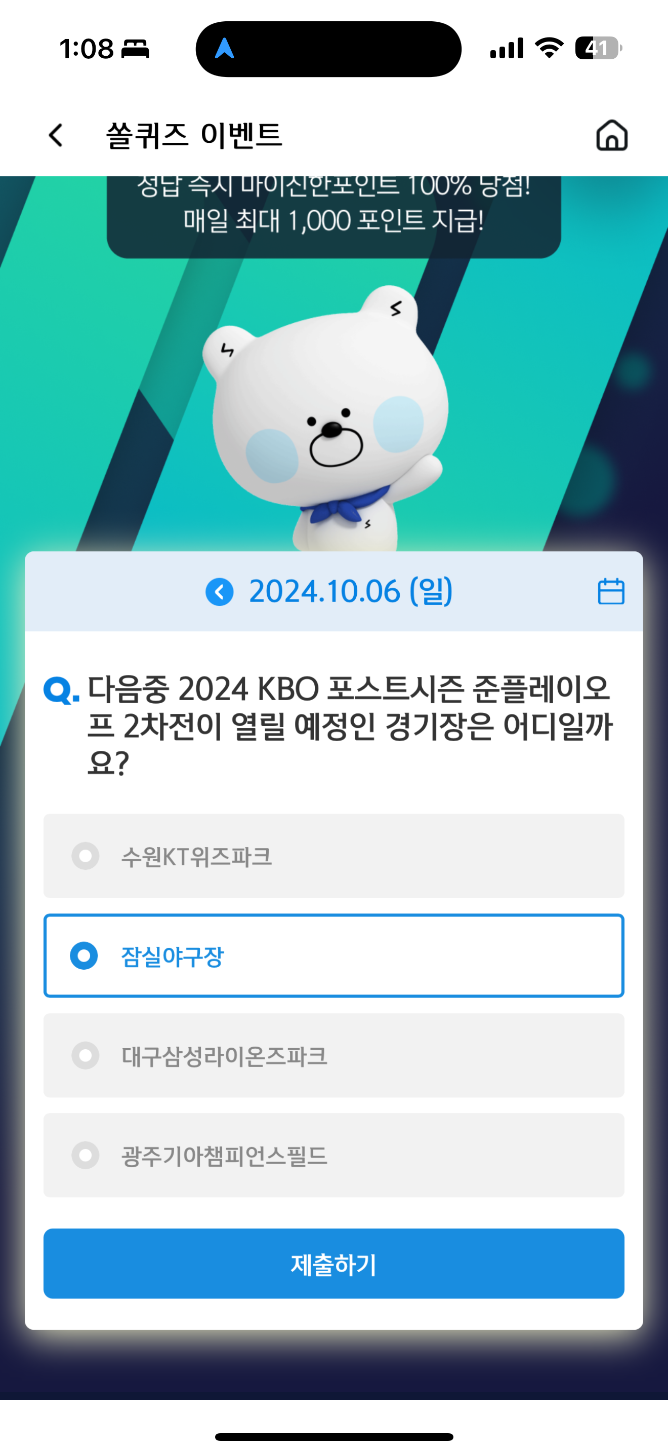 신한 슈퍼SOL 야구/상식 쏠퀴즈 10월 6일 정답(다음중 2024 KBO 포스트시즌 준플레이오프 2차전이 열릴 예정인 경기장은 어디일까요?)
