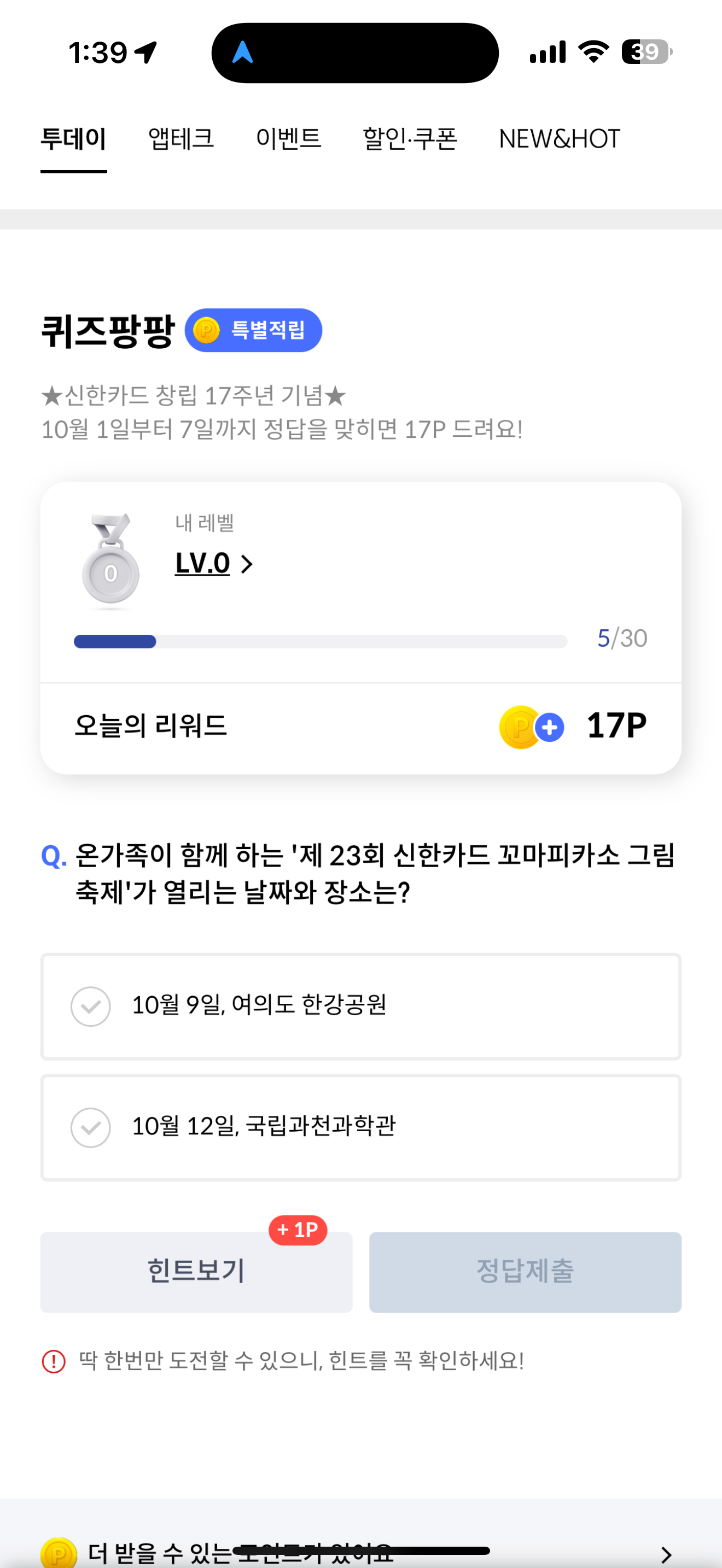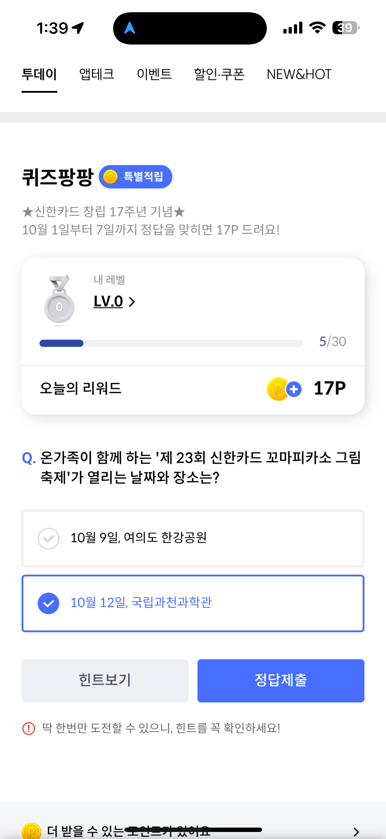 신한카드 퀴즈팡팡 정답은 10월 12일, 국립과천과학관 입니다