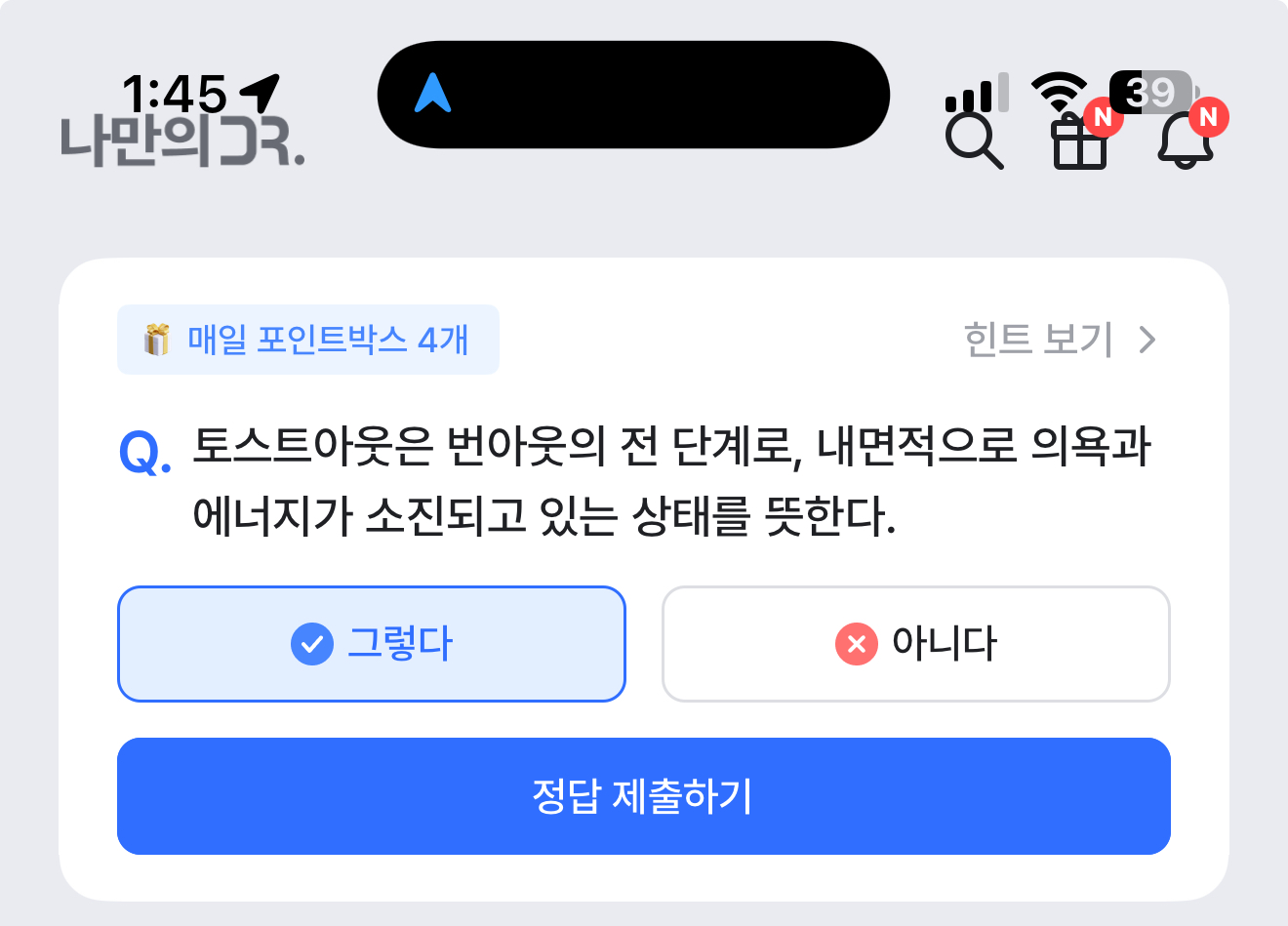 나만의 닥터 퀴즈 10월 6일 정답(토스트아웃은 번아웃의 전 단계로, 내면적으로 의욕과 에너지가 소진되고 있는 상태를 뜻한다)