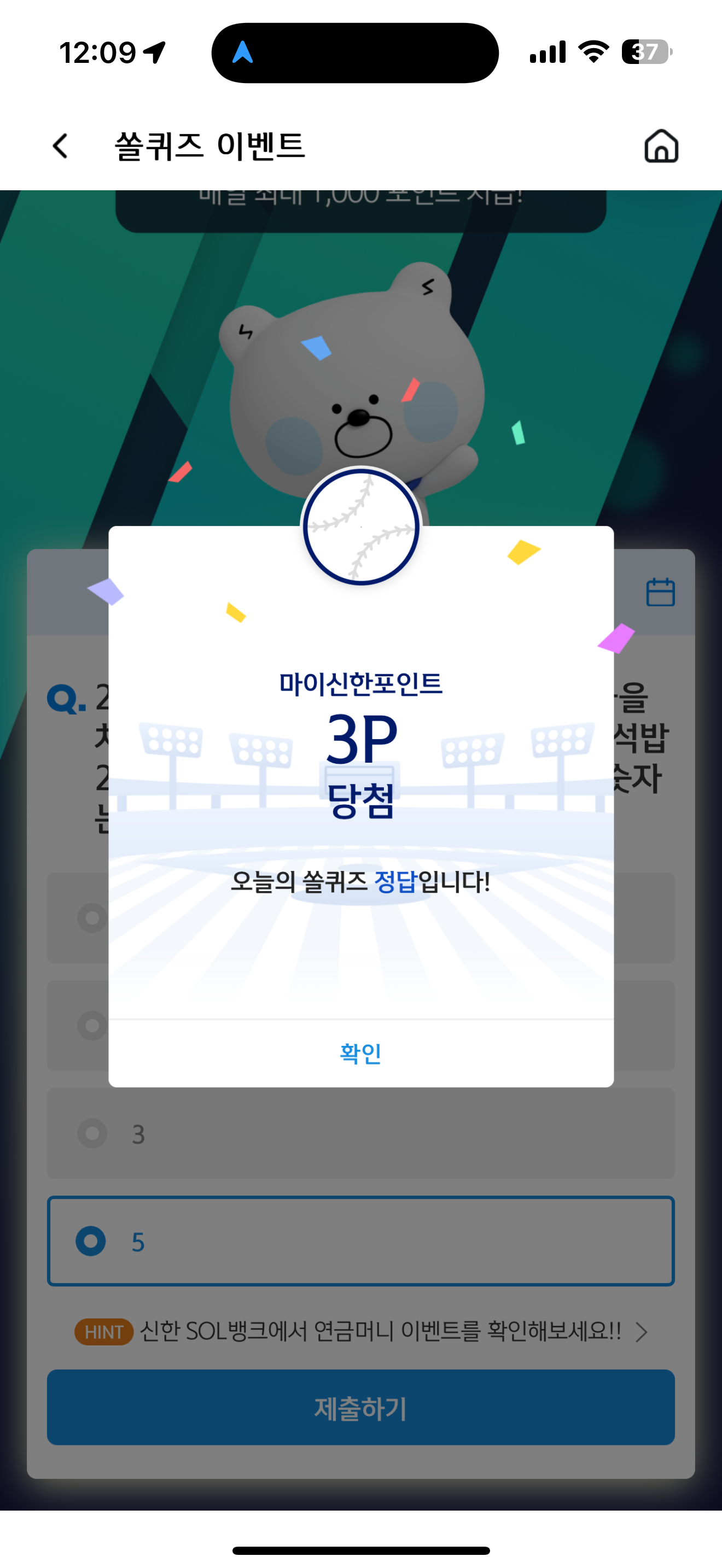 신한 슈퍼SOL 야구/상식 쏠퀴즈 정답은 5 입니다