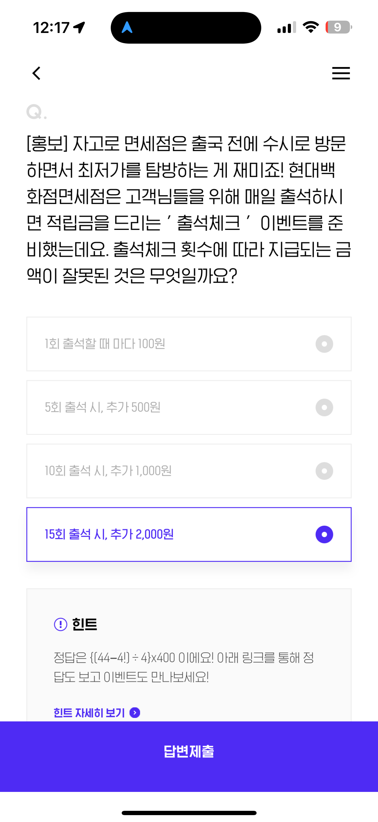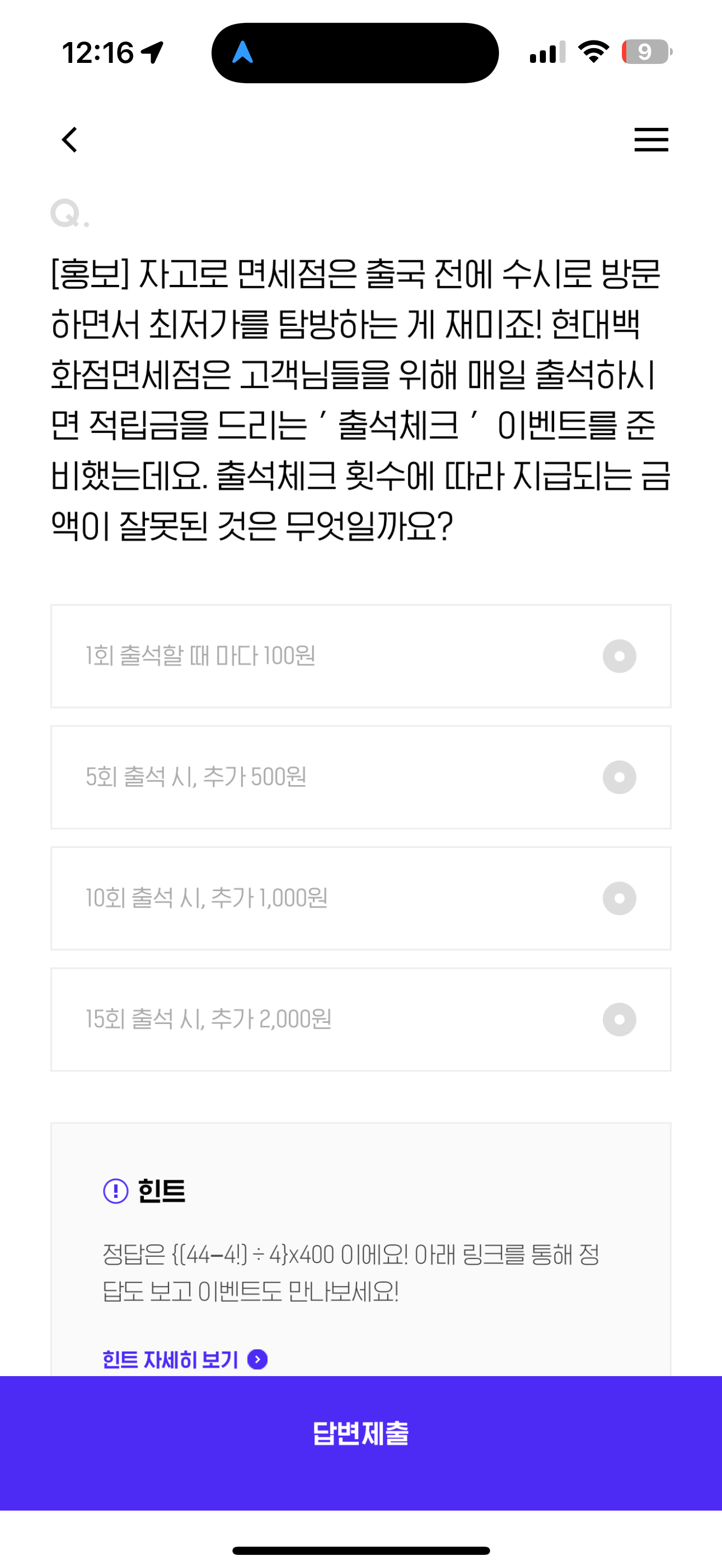 H포인트 퀴즈 10월 9일 정답(자고로 면세점은 출국 전에 수시로 방문하면서 최저가를 탐방하는 게 재미죠! 현대백화점면세점은 고객님들을 위해 매일 출석하시면 적립금을 드리는 ' 출석체크 ' 이벤트를 준비했는데요)