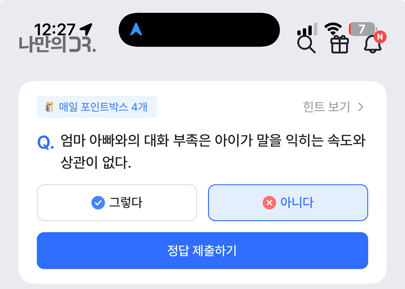 나만의 닥터 퀴즈 10월 9일 정답(엄마 아빠와의 대화 부족은 아이가 말을 익히는 속도와 상관이 없다)