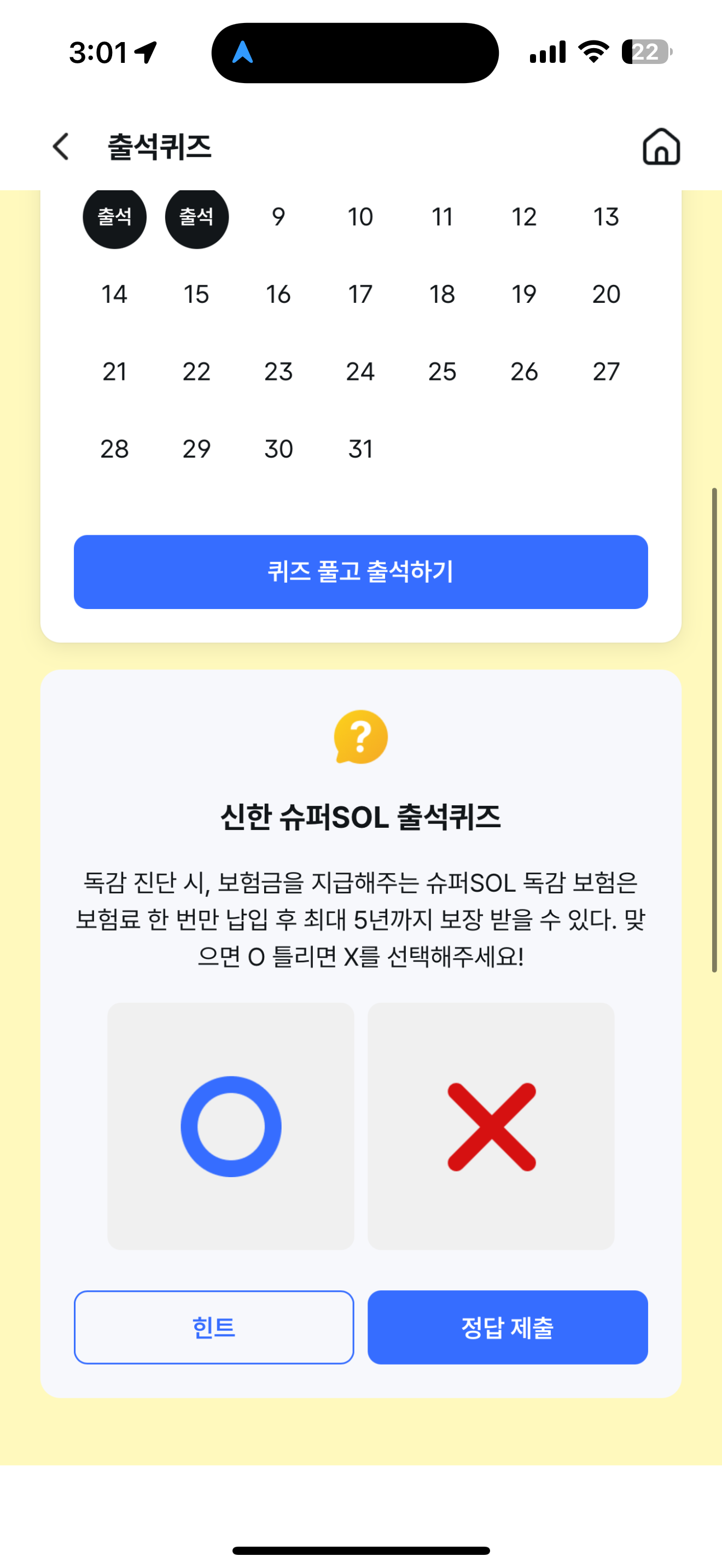 신한 슈퍼SOL 출석퀴즈 정답은 O 입니다