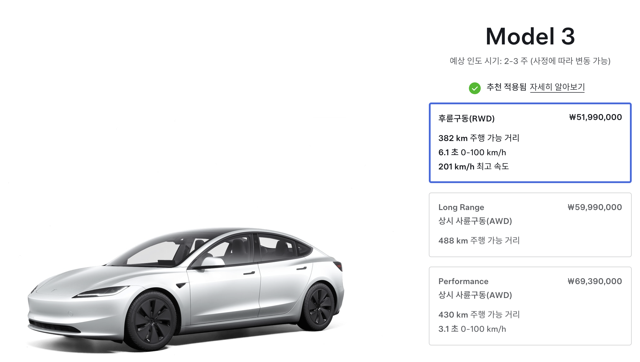 테슬라 모델3 가격표입니다. 여기서 66만원씩 할인을 받을 수 있습니다. 테슬라 모델3는 최근 풀체인지를 해서 완전히 새로운 디자인을 가지고 있습니다. 당분간 디자인 바뀔일은 없으니 가장 합리적인 선택지가 될 것입니다.