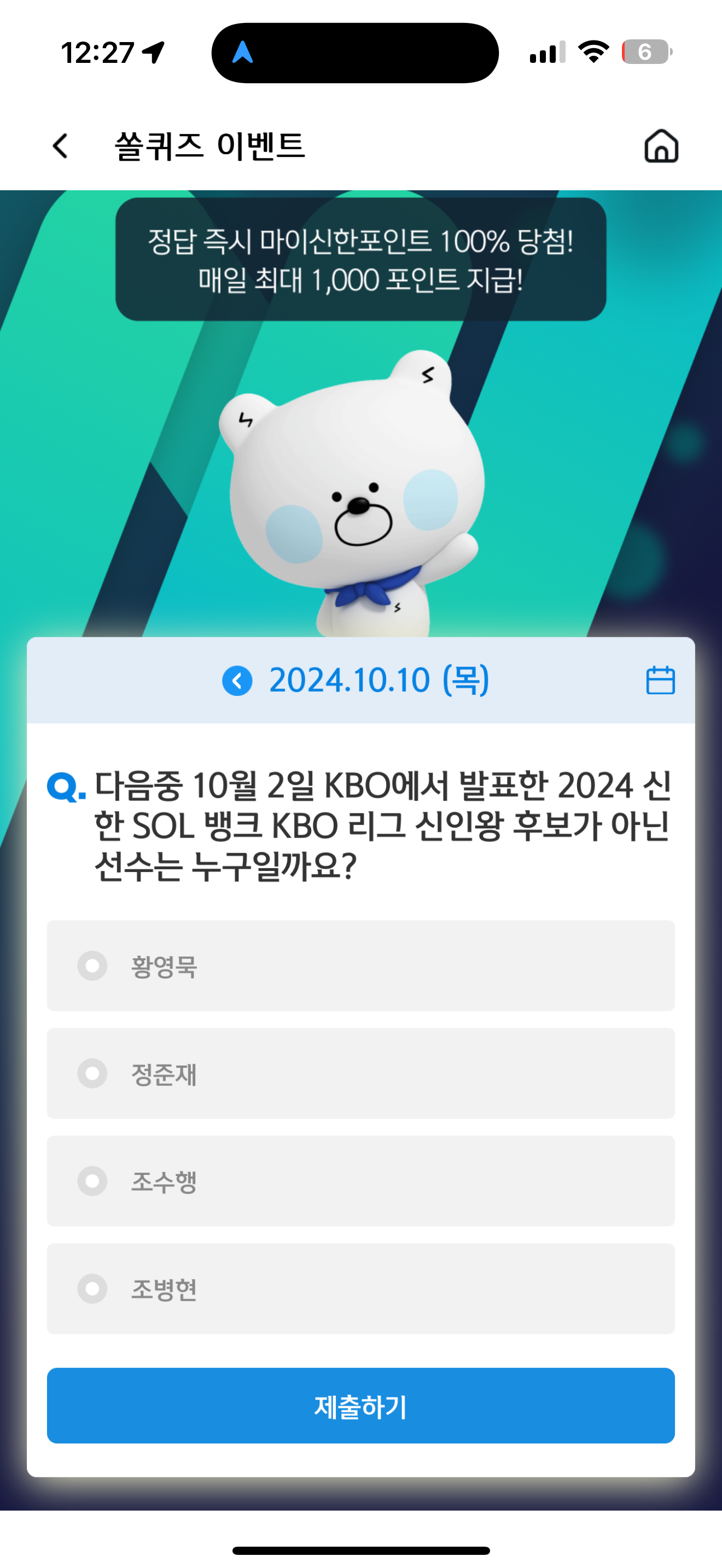 신한 슈퍼SOL 야구/상식 쏠퀴즈 10월 10일 문제입니다