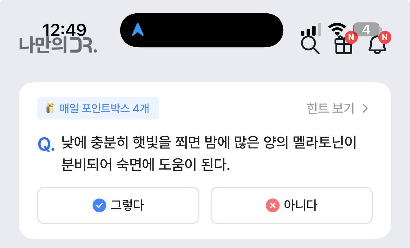 낮에 충분히 햇빛을 쬐면 밤에 많은 양의 멜라토닌이 분비되어 숙면에 도움이 된다. 그렇다. 아니다 선택하면 되는데요. 과연 낮에 햇빛을 많이 쐬면 밤에 잘 잘수 있을까요? 햇빛은 활력을 주는 요소이기도 한데요. 그 활력이 야간 수면에 도움이 될지 생각해 보면 답이 될 것입니다.