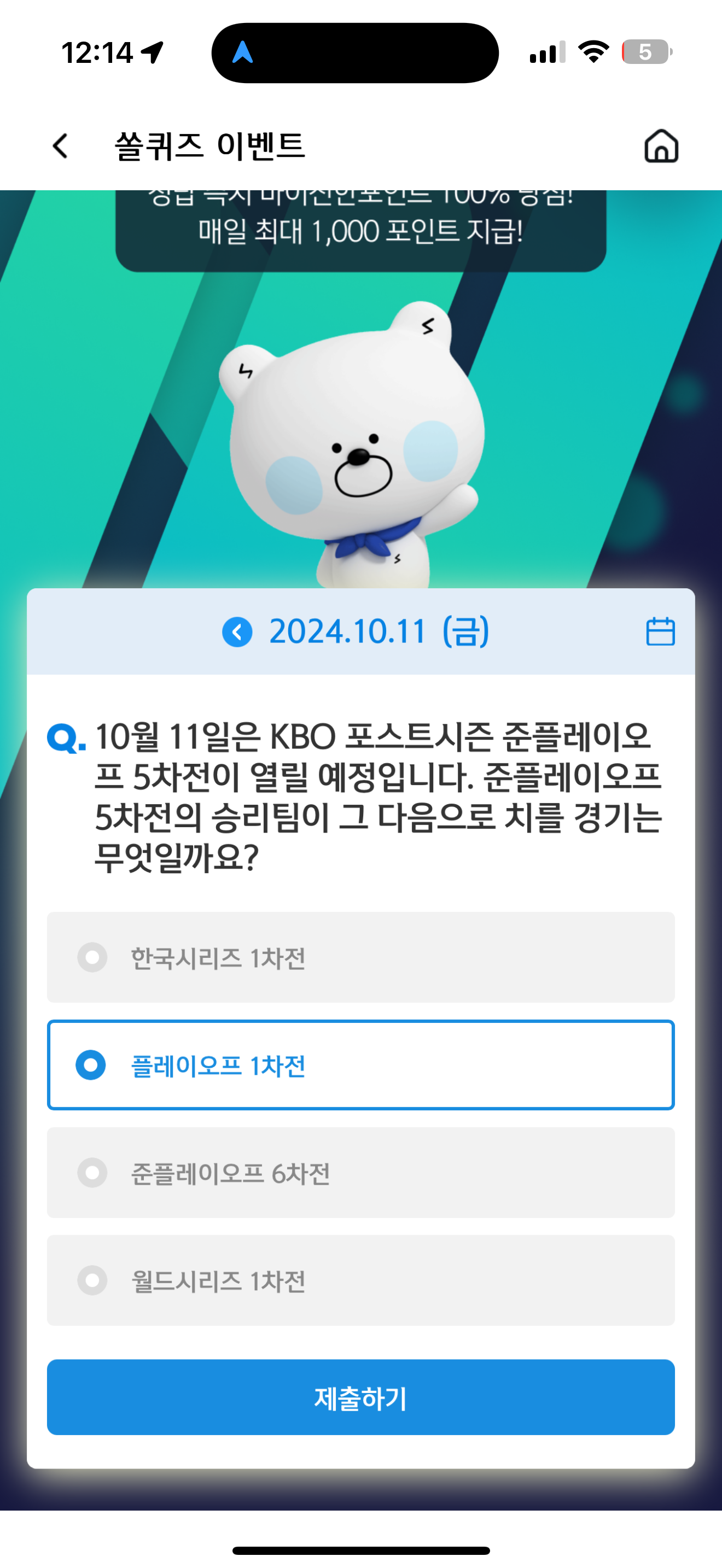 신한 슈퍼SOL 야구/상식 쏠퀴즈 정답은 플레이오프 1차전 입니다