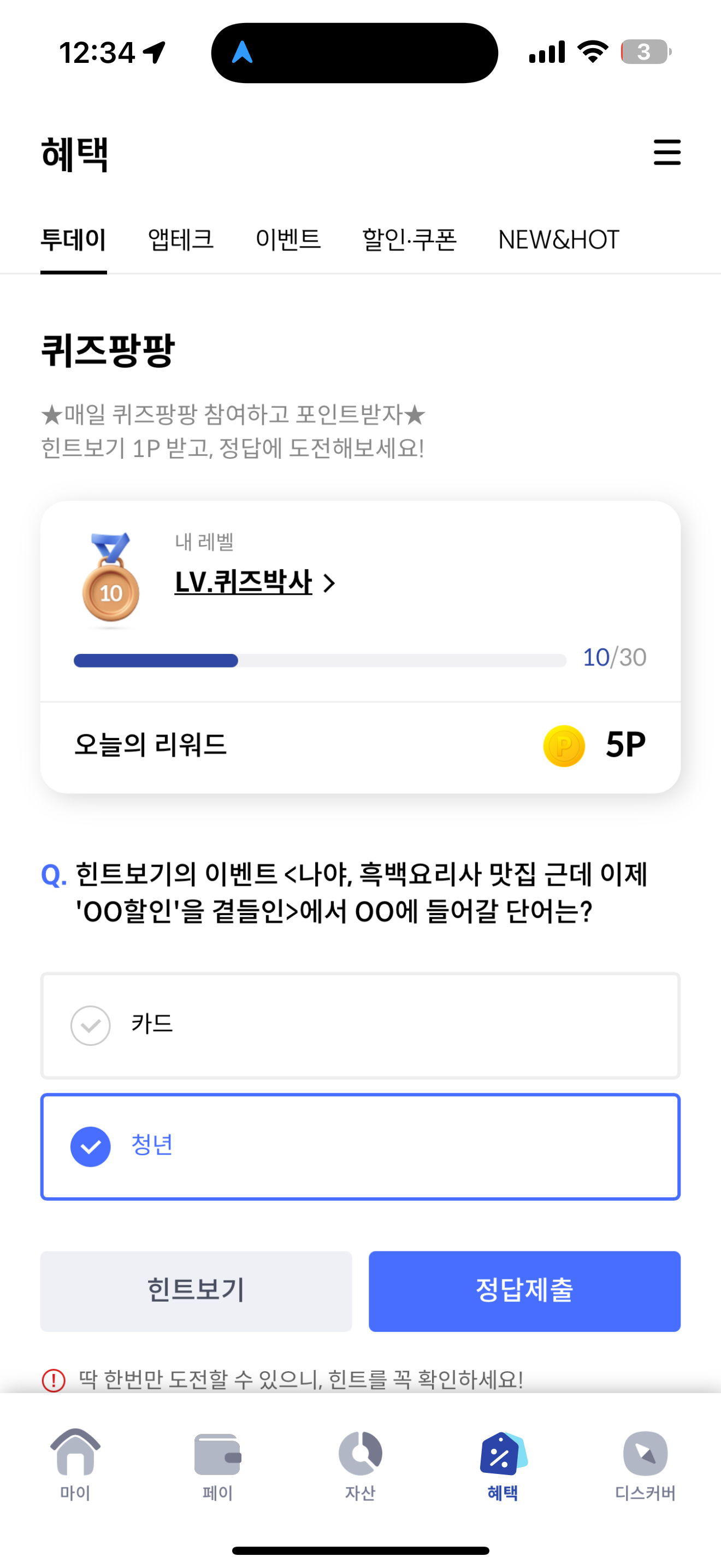 힌트보기의 이벤트 <나야, 흑백요리사 맛집 근데 이제 'OO할인'을 곁들인>에서 OO에 들어갈 단어는? 보기는 1. 카드 2. 청년 입니다. 요즘 흑백요리사가 대박이죠. 그거에 맞게 트랜디하게 준비된 이벤트입니다. 맛집 이용시 할인을 받을 수 있으니 참고해 두세요