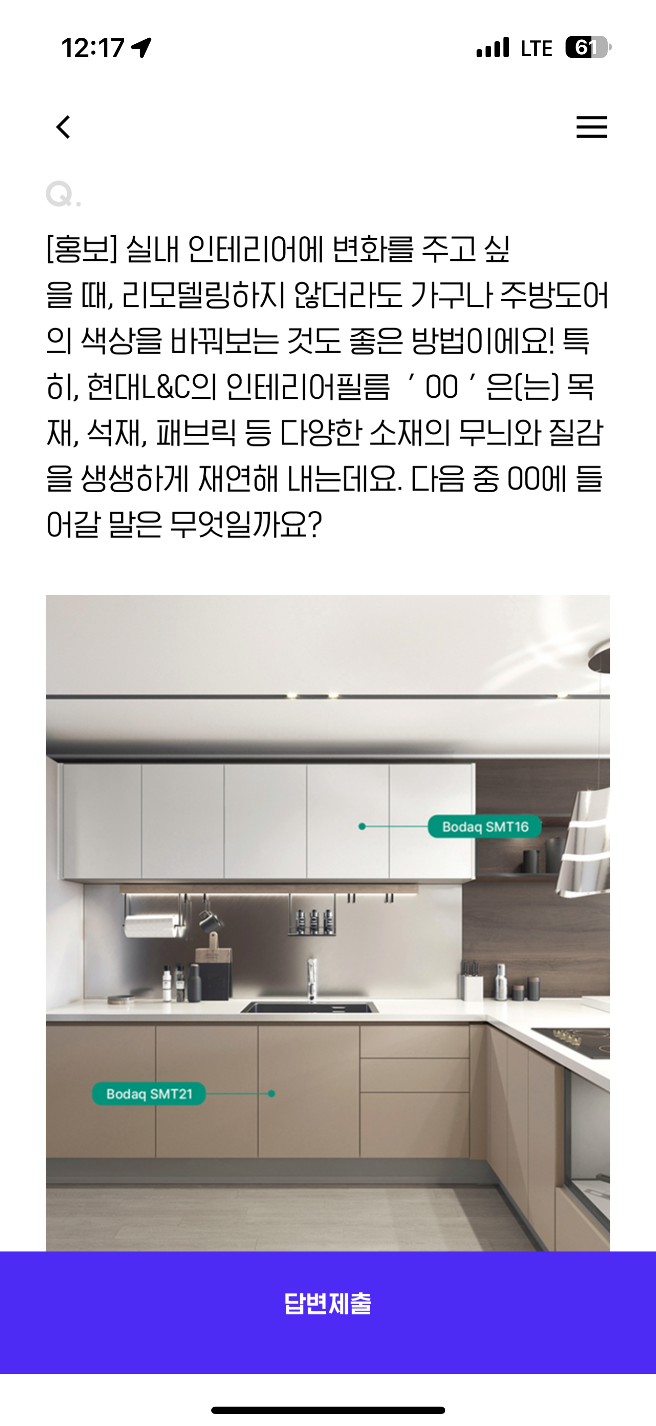 실내 인테리어에 변화를 주고 싶을 때, 리모델링하지 않더라도 가구나 주방도어의 색상을 바꿔보는 것도 좋은 방법이에요! 특히, 현대L&C의 인테리어플름 '00 ' 은(는) 목재, 석재, 패브릭 등 다양한 소재의 무늬와 질감을 생생하게 재연해 내는데요. 다음 중 00에 들어갈 말은 무엇일까요? 보기는 1. 보닥 2. 보물 3. 보리 4. 보석 입니다