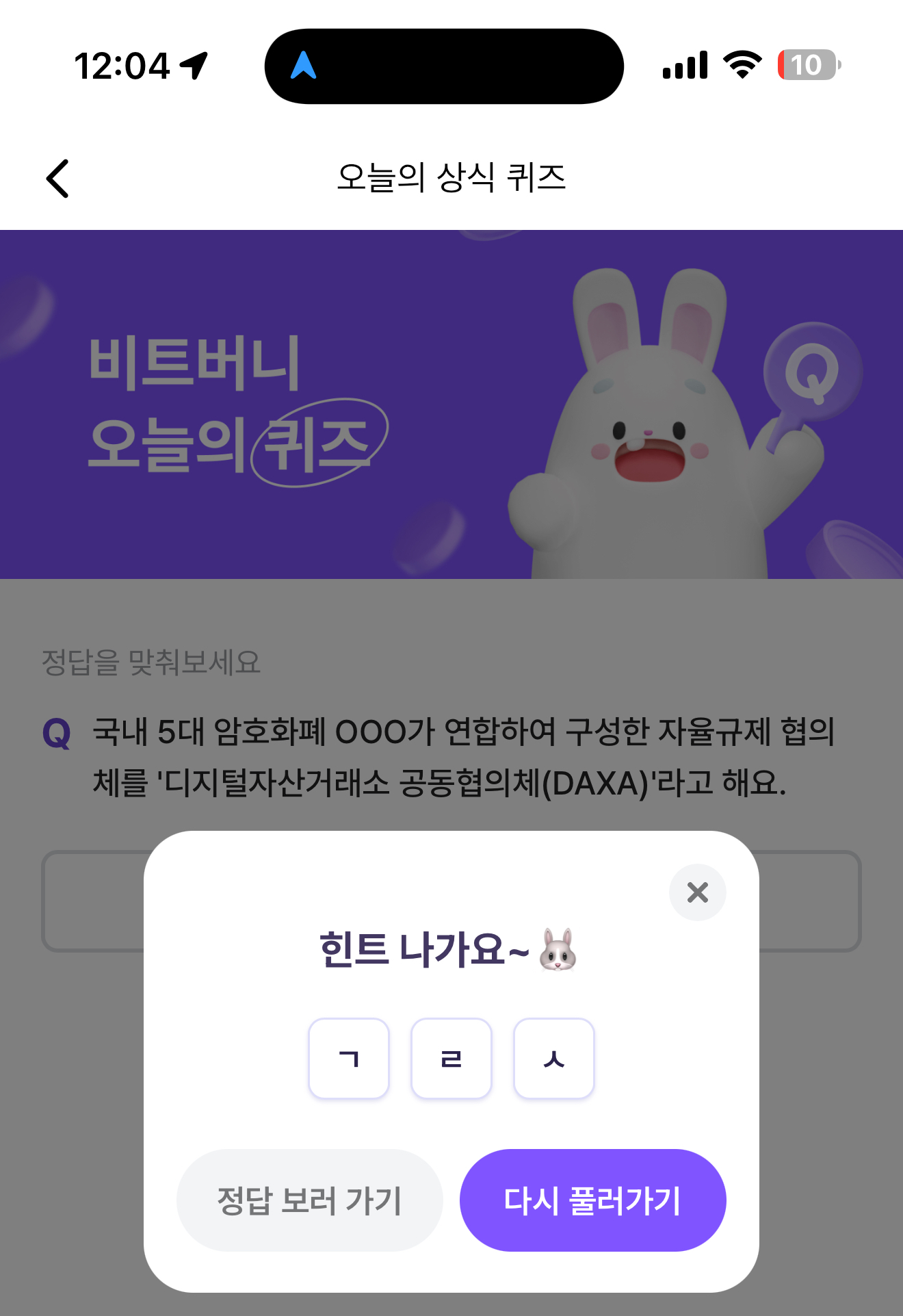 비트버니 오늘의 퀴즈 초성 힌트는 ㄱㄹㅅ 입니다