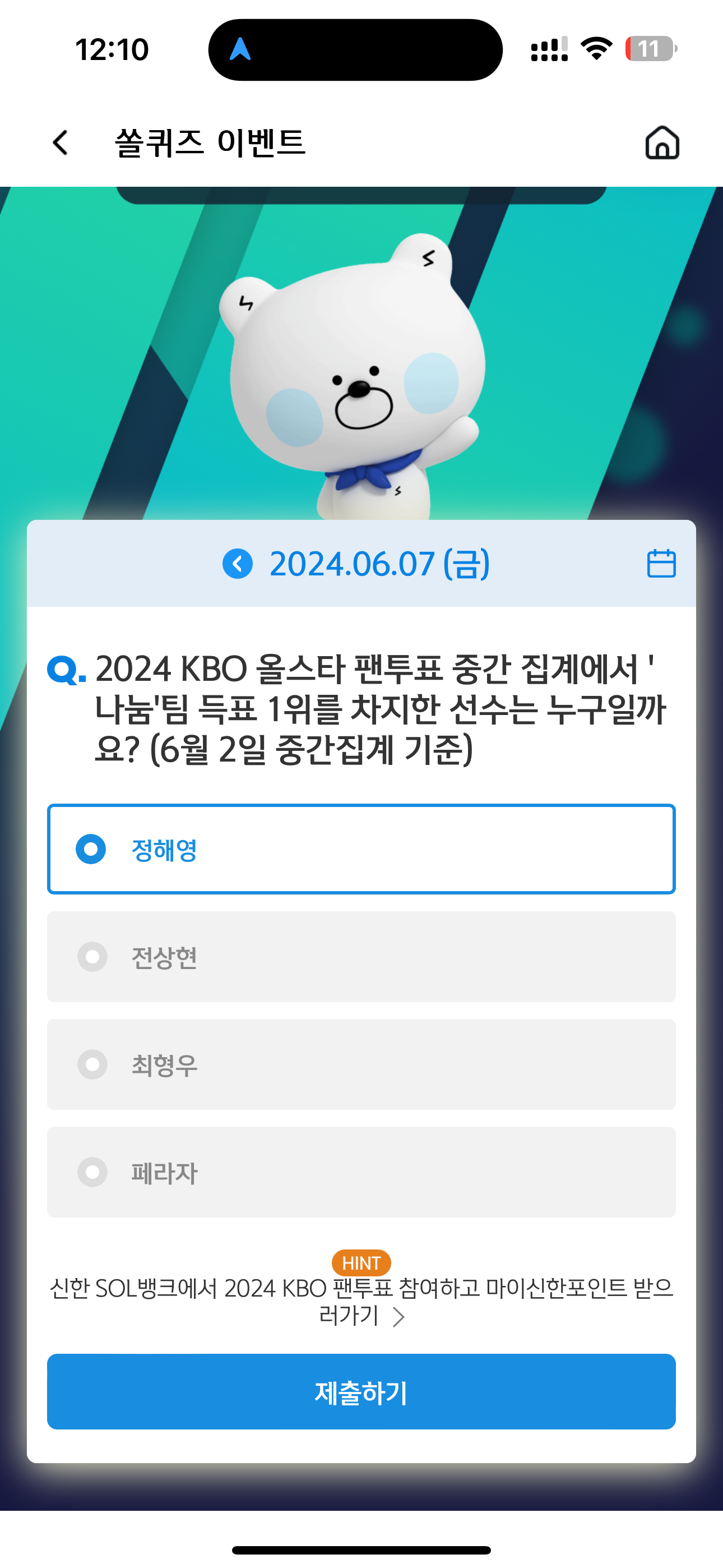 신한 슈퍼SOL 야구/상식 쏠퀴즈 정답은 정해영 입니다