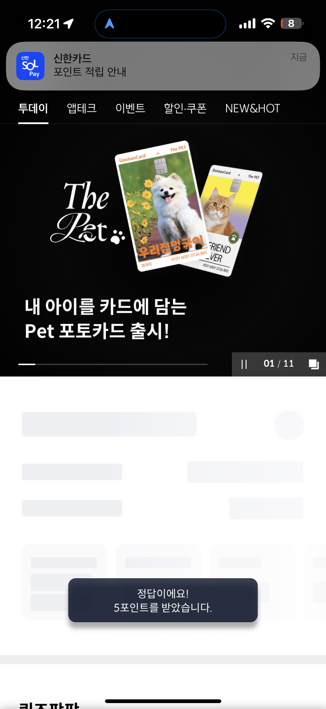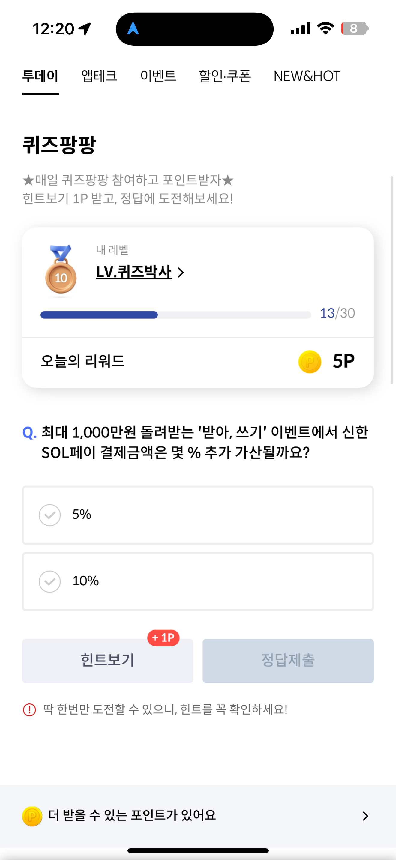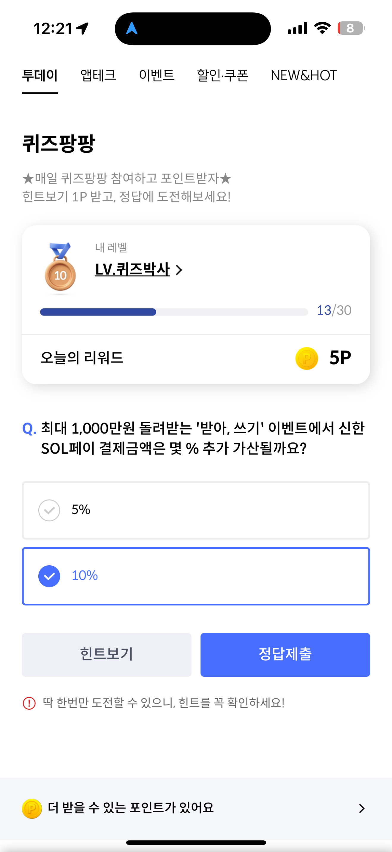 신한카드 퀴즈팡팡 정답은 10% 입니다