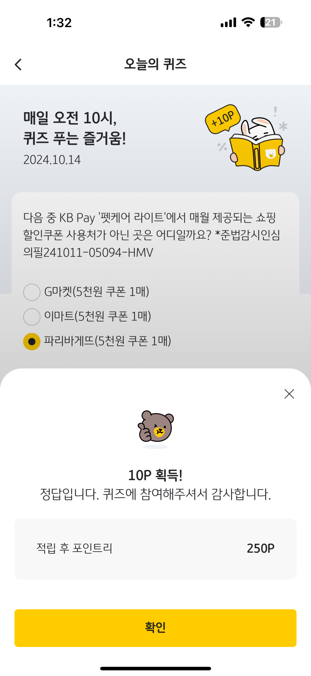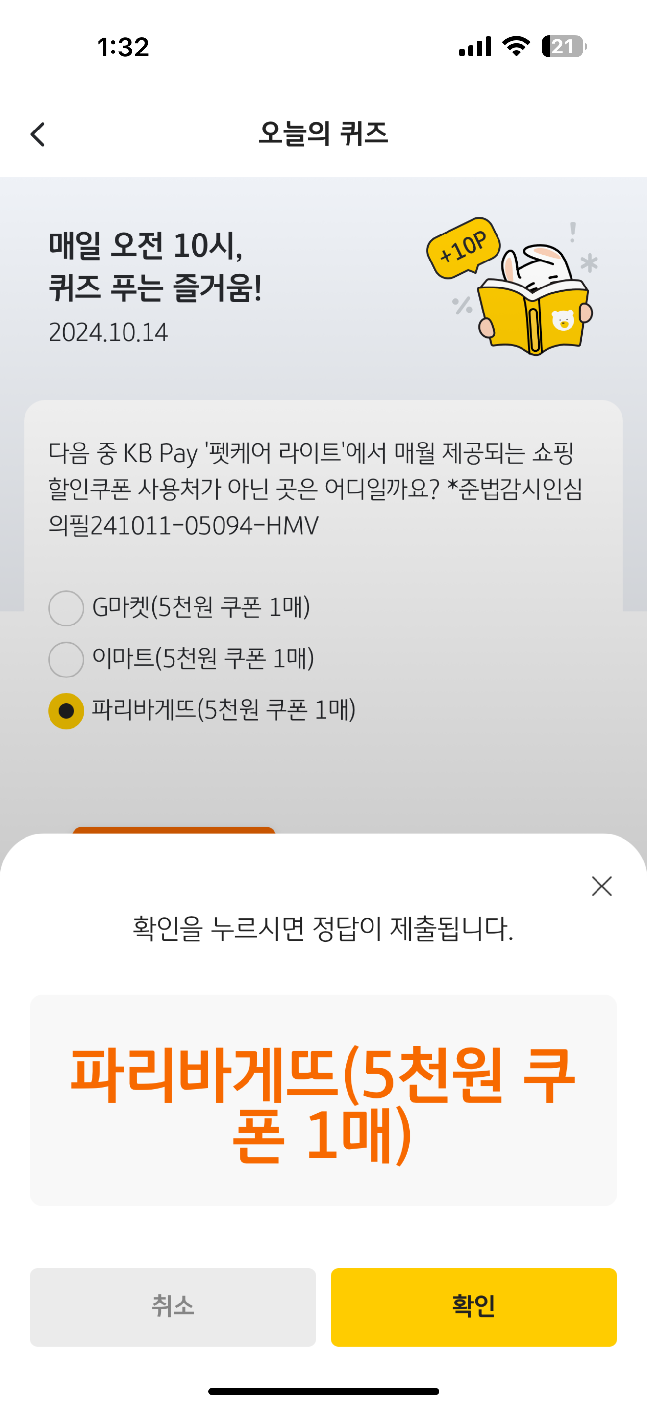 KB Pay 오늘의 퀴즈 정답은 파리바게뜨(5천원 쿠폰 1매) 입니다
