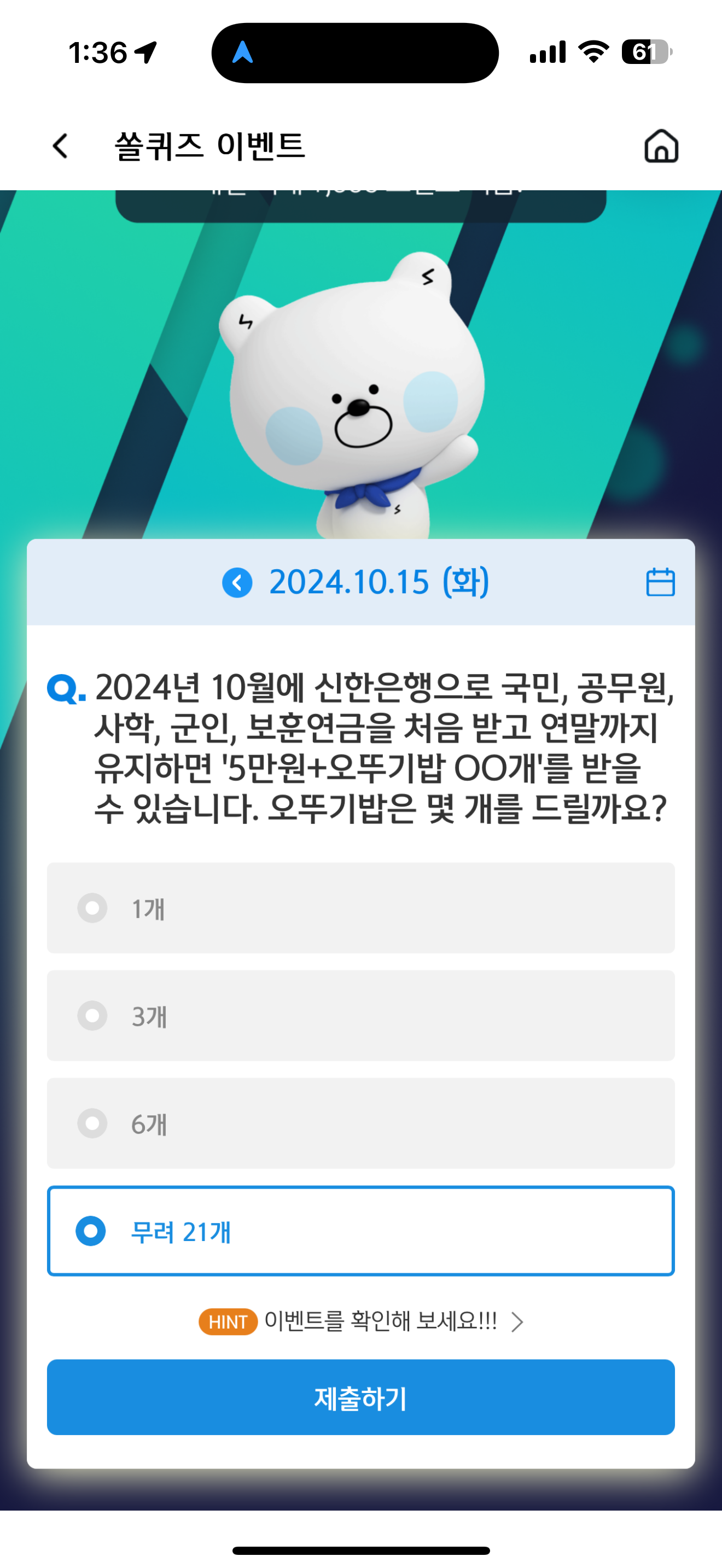 신한 슈퍼SOL 야구/상식 쏠퀴즈 10월 15일 정답(2024년 10월에 신한은행으로 국민, 공무원, 사학, 군인, 보훈연금을 처음 받고 연말까지 유지하면 '5만원+오뚜기밥 OO개'를 받을 수 있습니다)