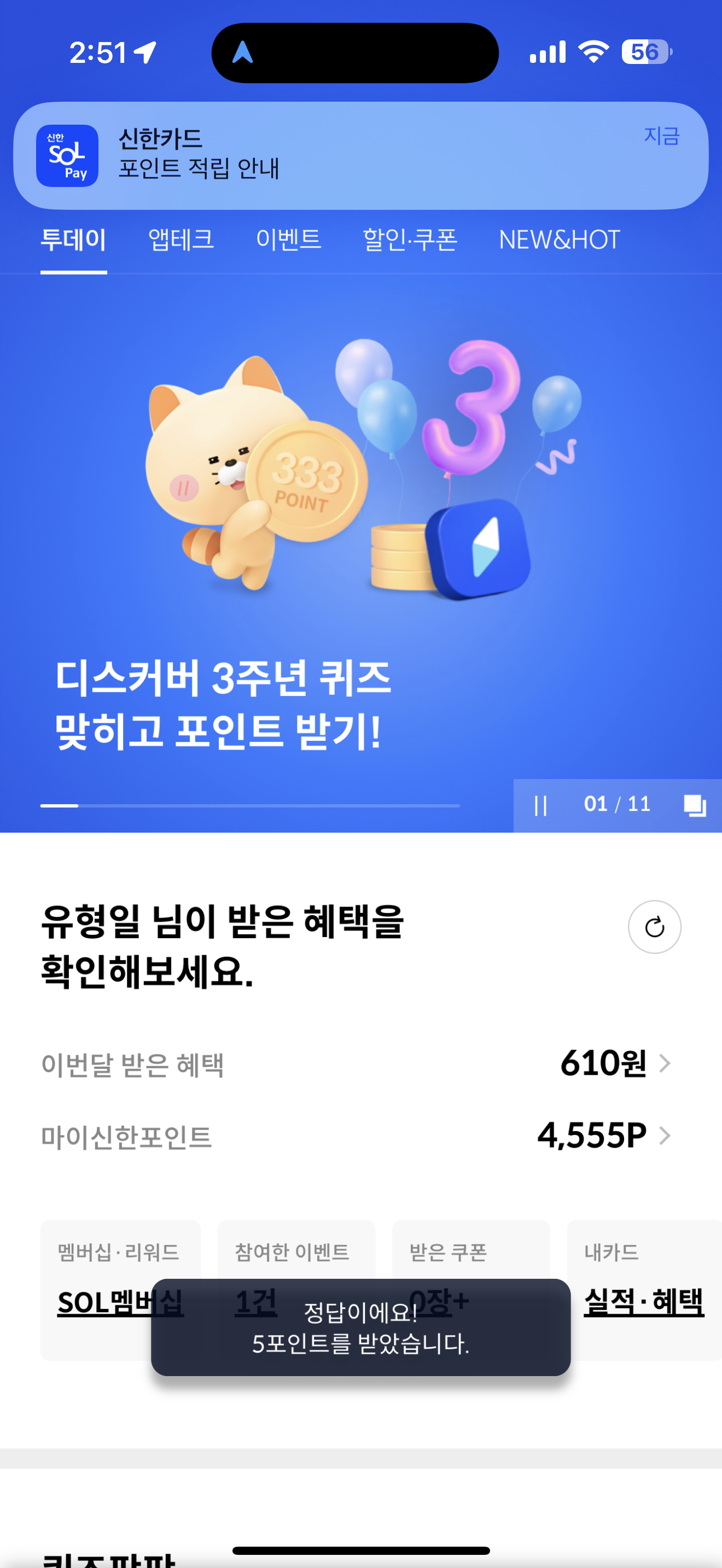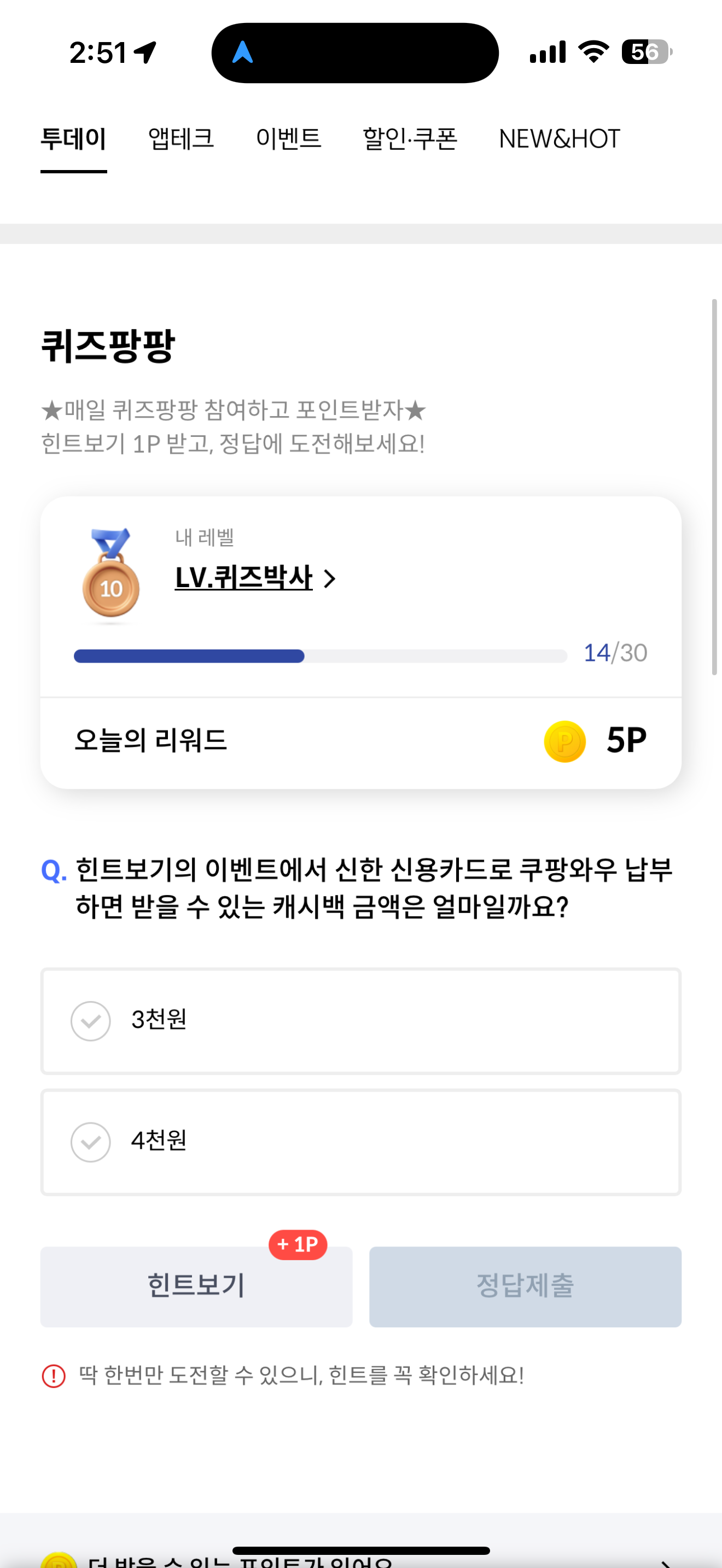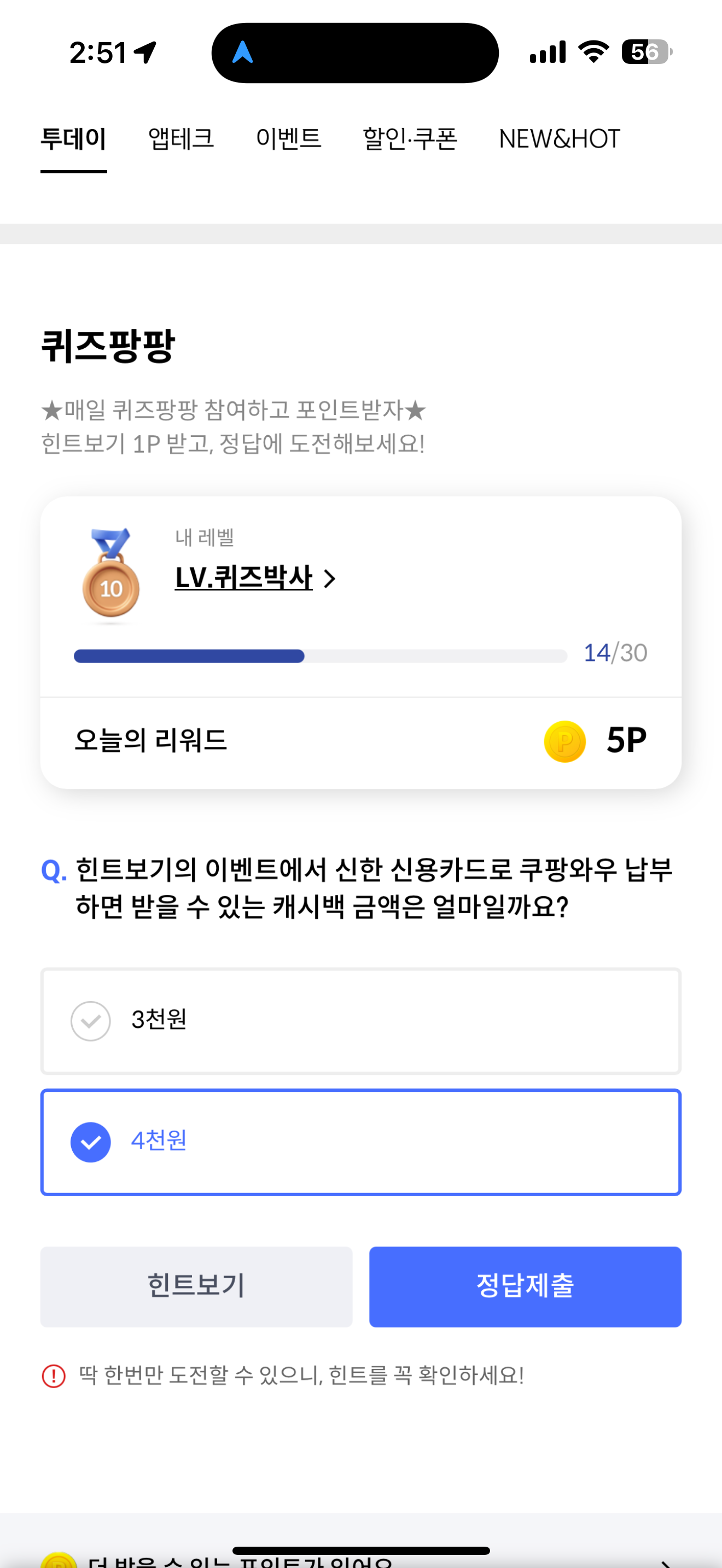 신한카드 퀴즈팡팡 정답은 4천원 입니다