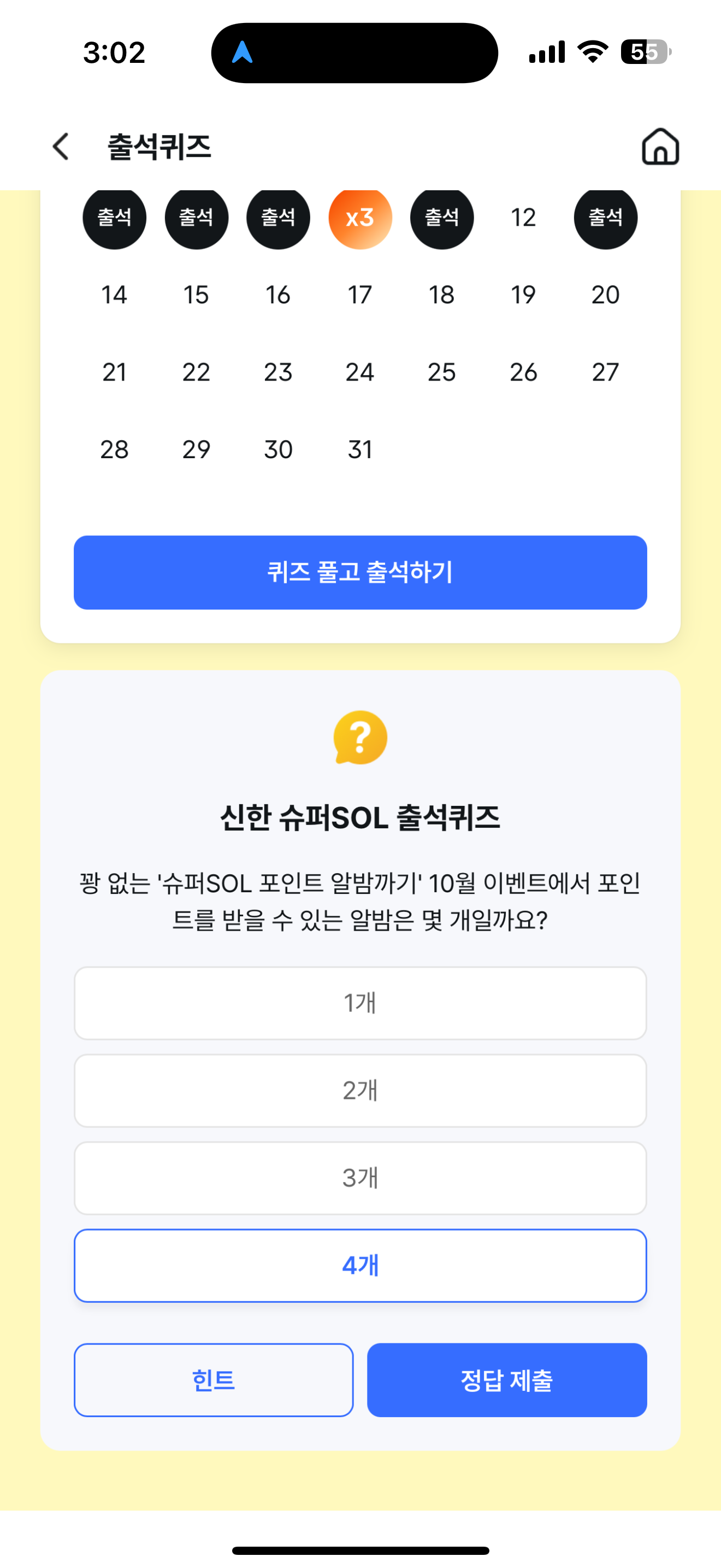 신한 슈퍼SOL 출석퀴즈 정답은 4개 입니다