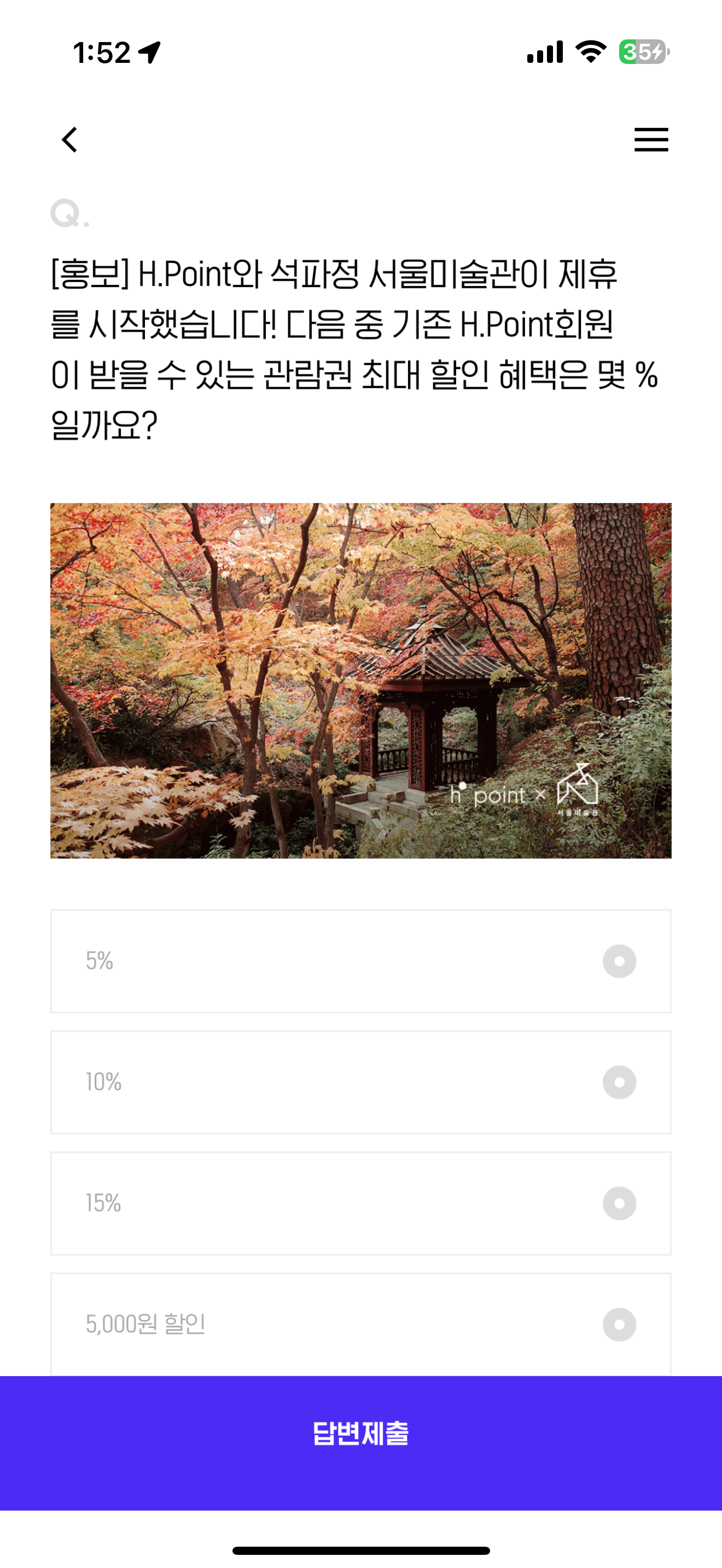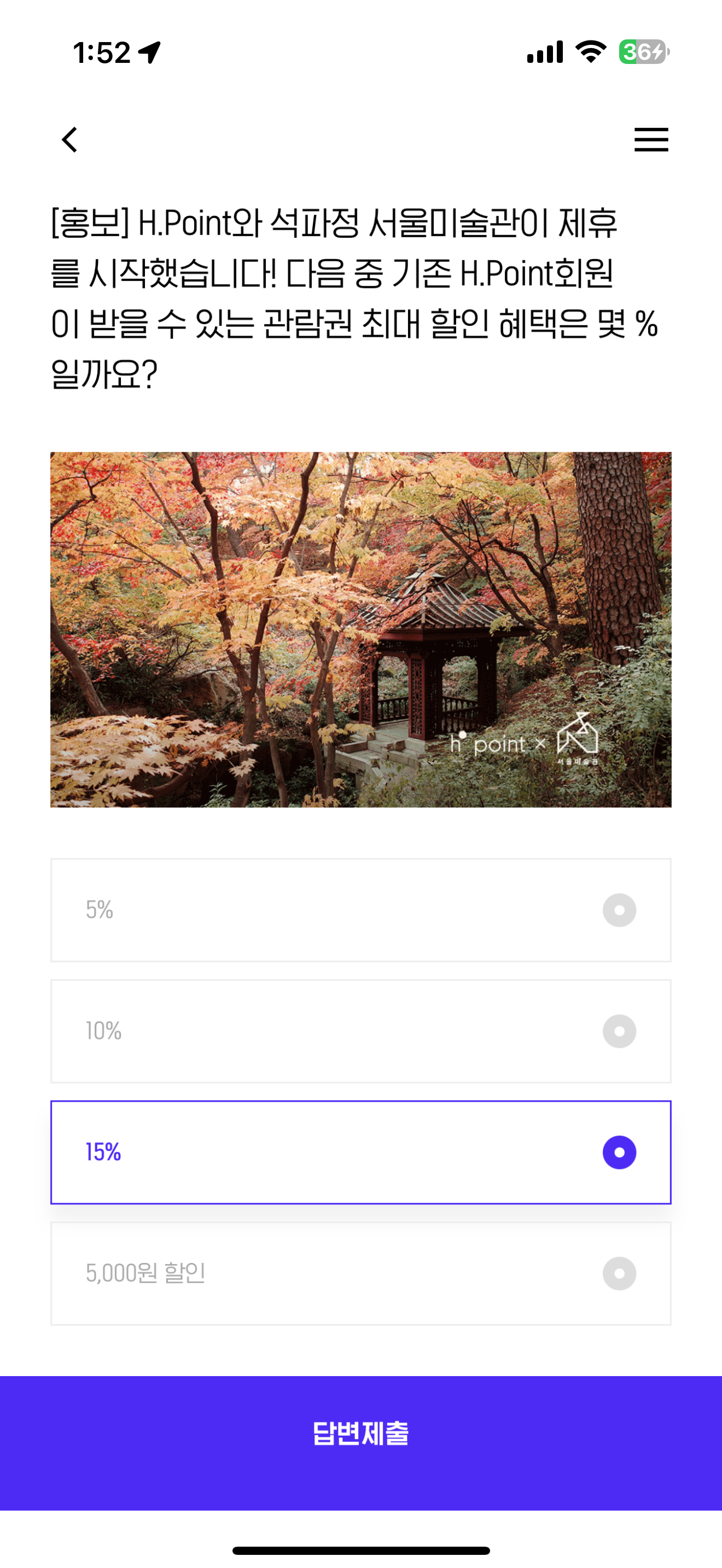 H.Point와 석파정 서울미술관이 제휴를 시작했습니다! 다음 중 기존 H.Point회원이 받을 수 있는 관람권 최대 할인 혜택은 몇 %일까요? 보기는 1. 5% 2. 10% 3. 15% 4. 5,000원 할인 입니다. 서울미술관을 가면 다양한 전시들을 볼 수 있습니다. 예술의 세계를 좋아하는 분이라면 할인 혜택 잘 받아보세요