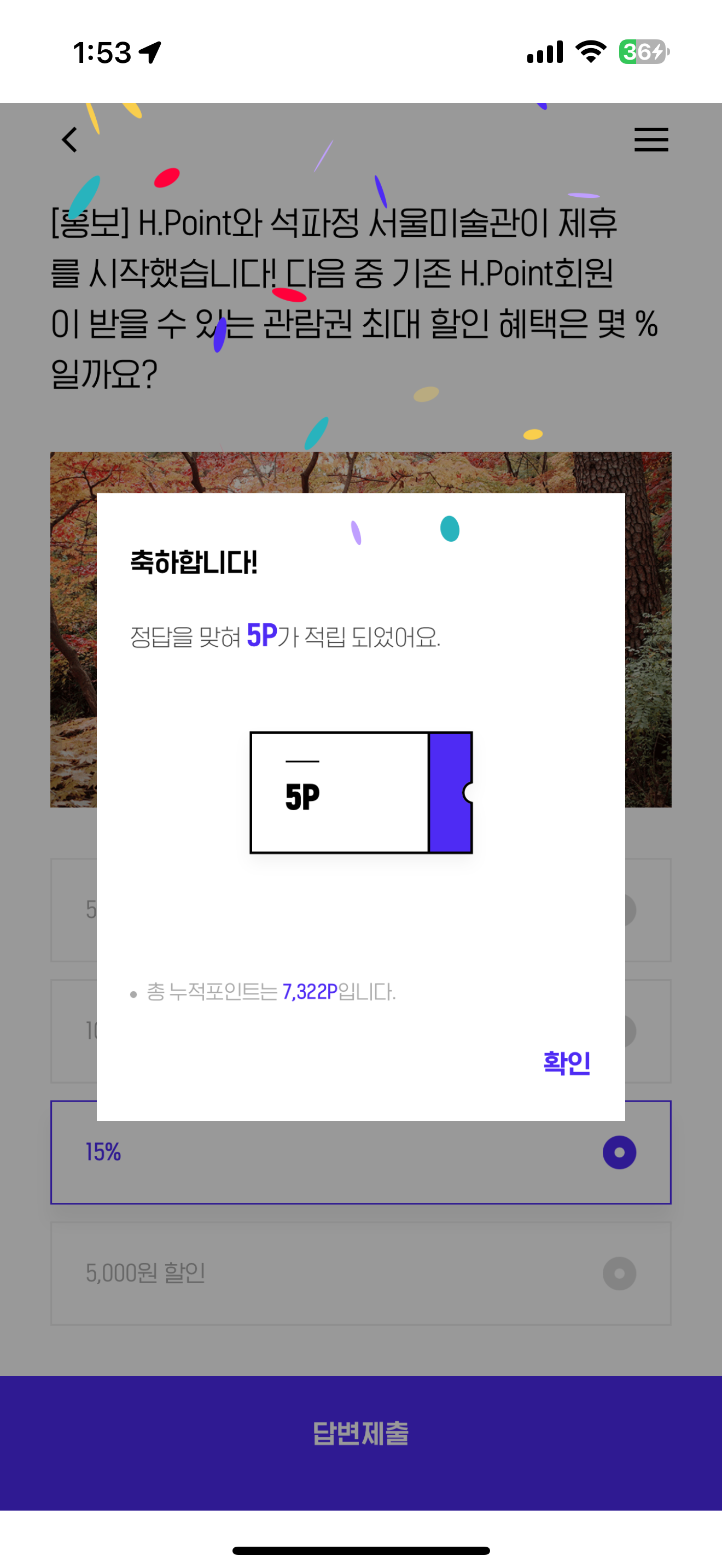 H포인트 퀴즈 정답은 15% 입니다