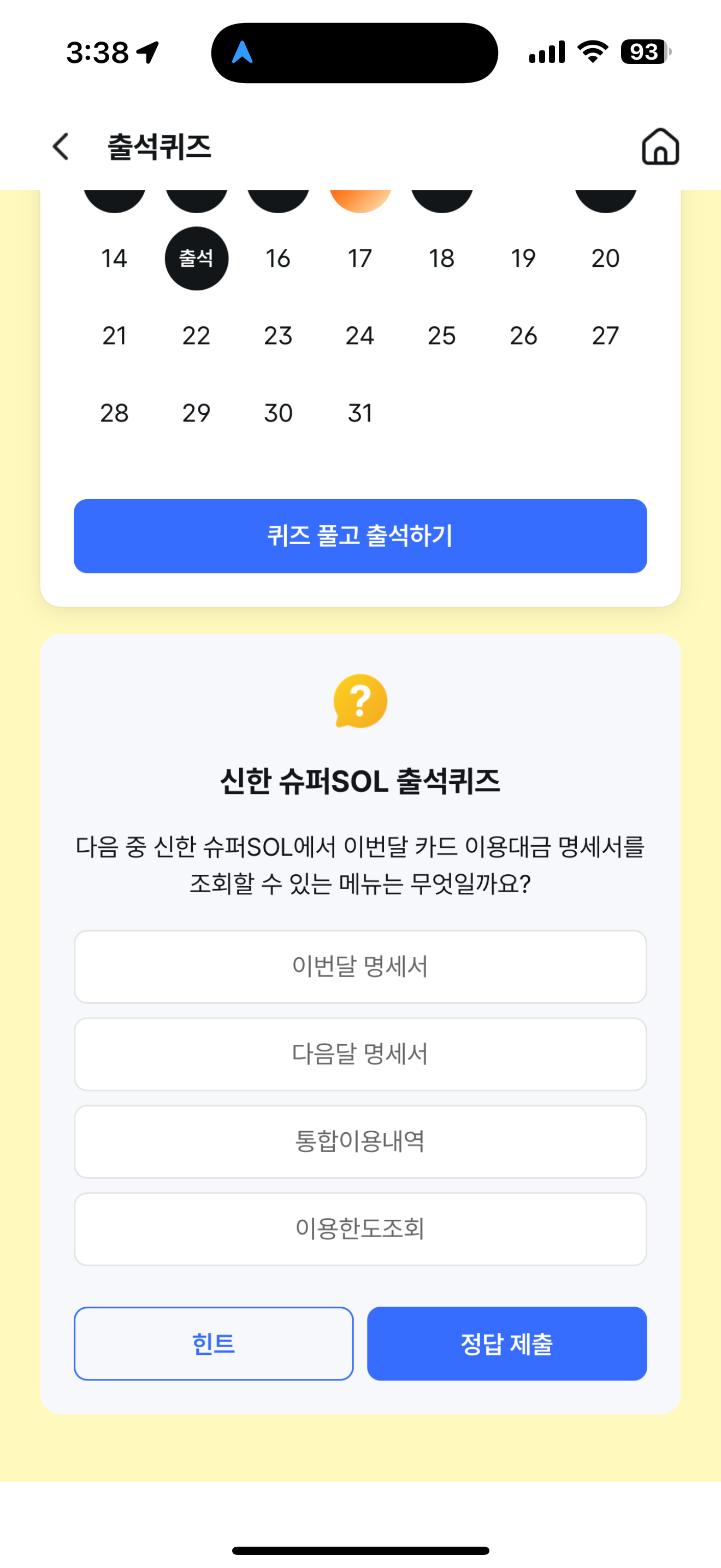 신한 슈퍼SOL 출석퀴즈 정답은 이번달 명세서 입니다