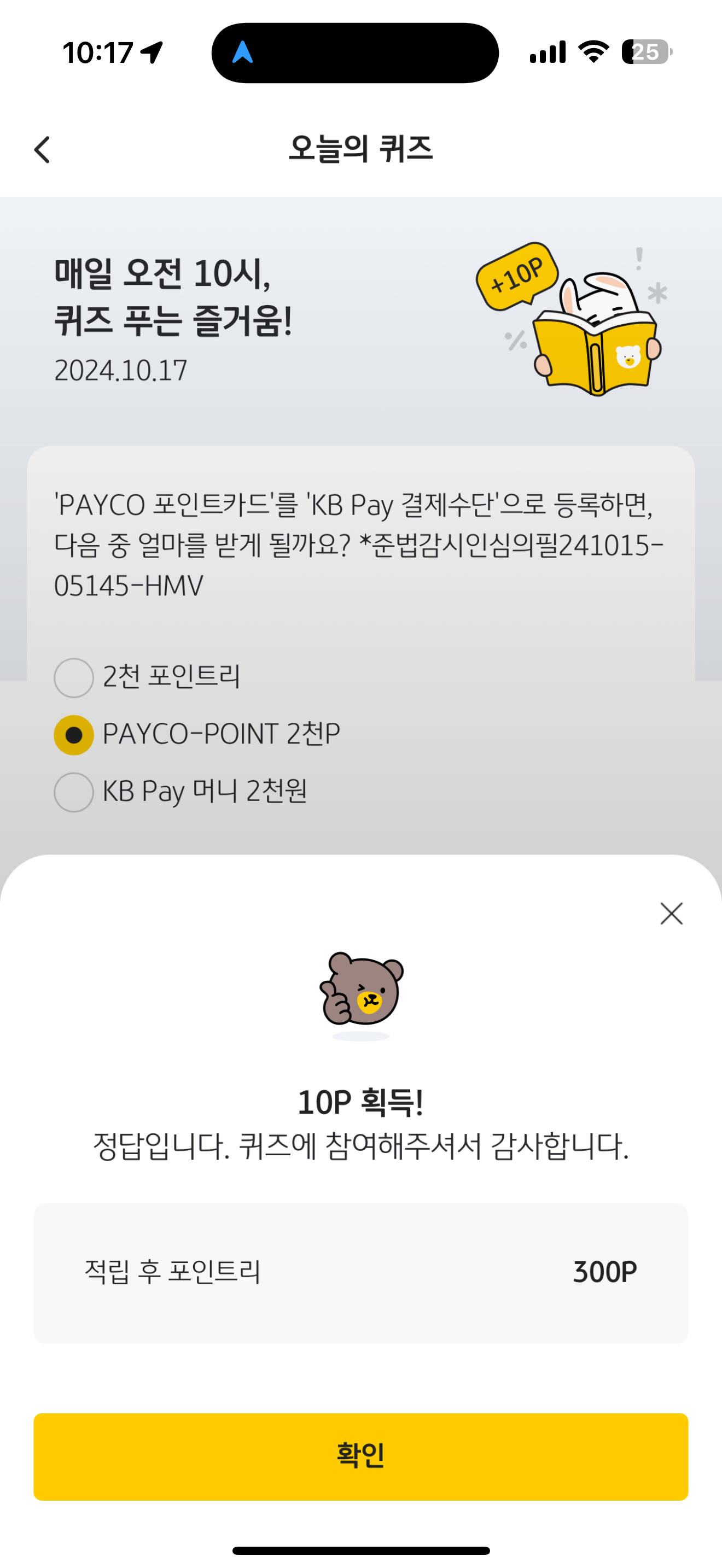 KB Pay 오늘의 퀴즈 정답은 PAYCO-POINT 2천P 입니다