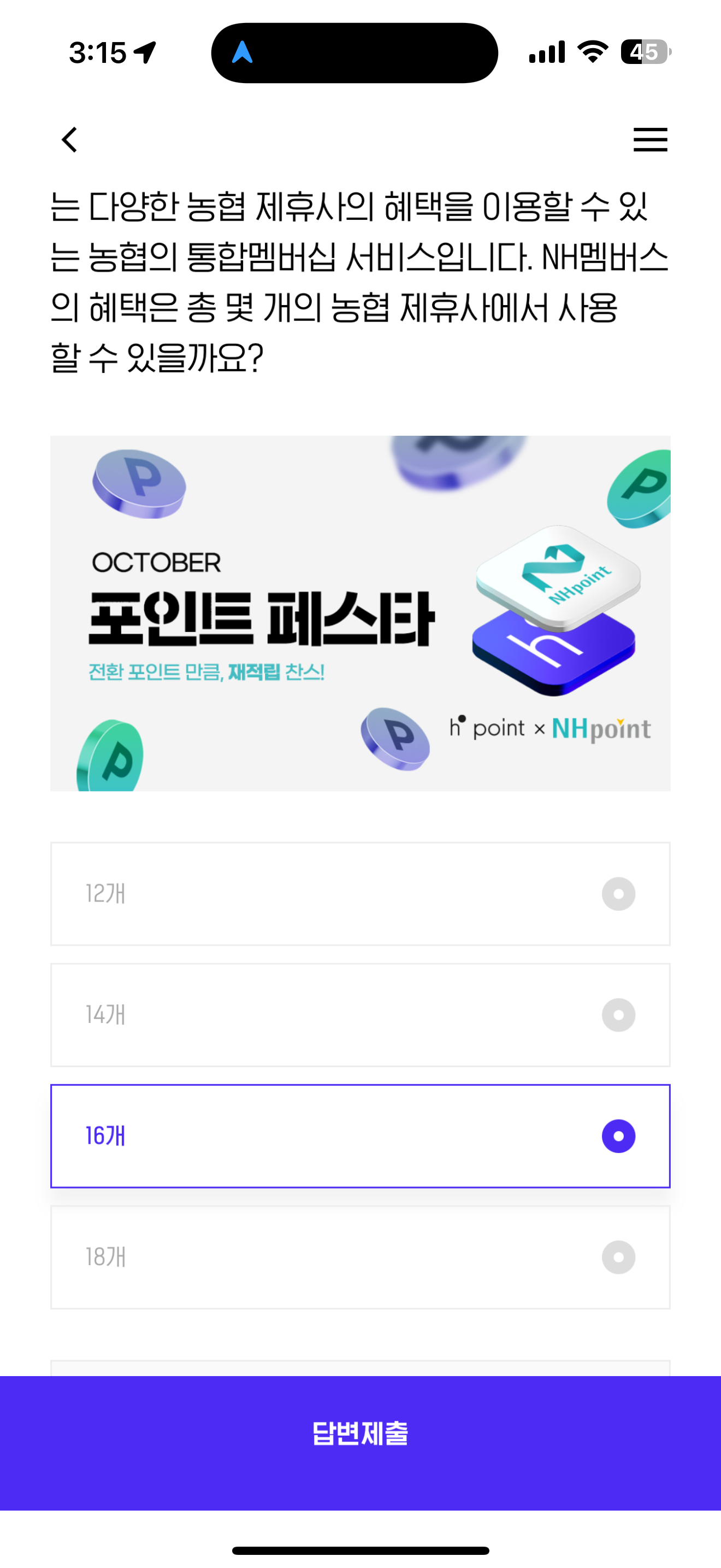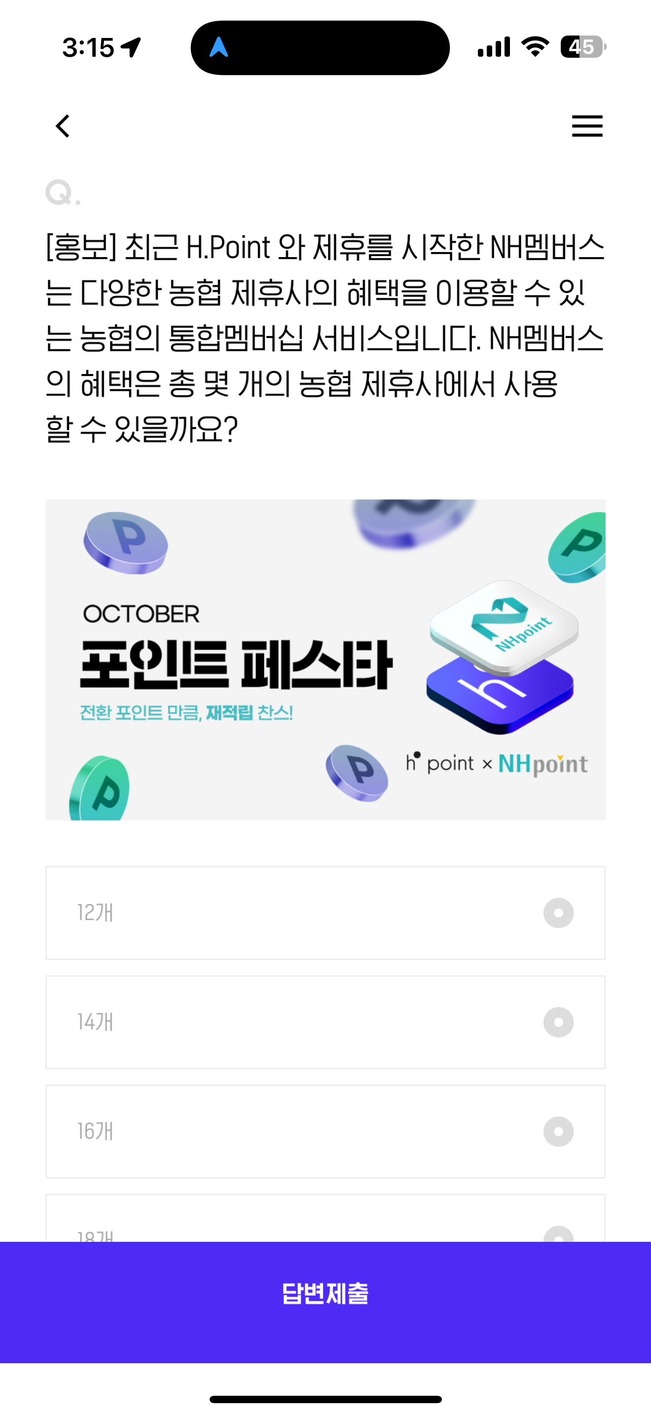 최근 H.Point 와 제휴를 시작한 NH멤버스는 다양한 농협 제휴사의 혜택을 이용할 수 있는 농협의 통합멤버십 서비스입니다. NH멤버스의 혜택은 총 몇 개의 농협 제휴사에서 사용할 수 있을까요? 보기는 1. 12개 2. 14개 3. 16개 4. 18개 입니다. NH멤버스와 H.Point제휴를 통해 혜택을 받을 수 있습니다.