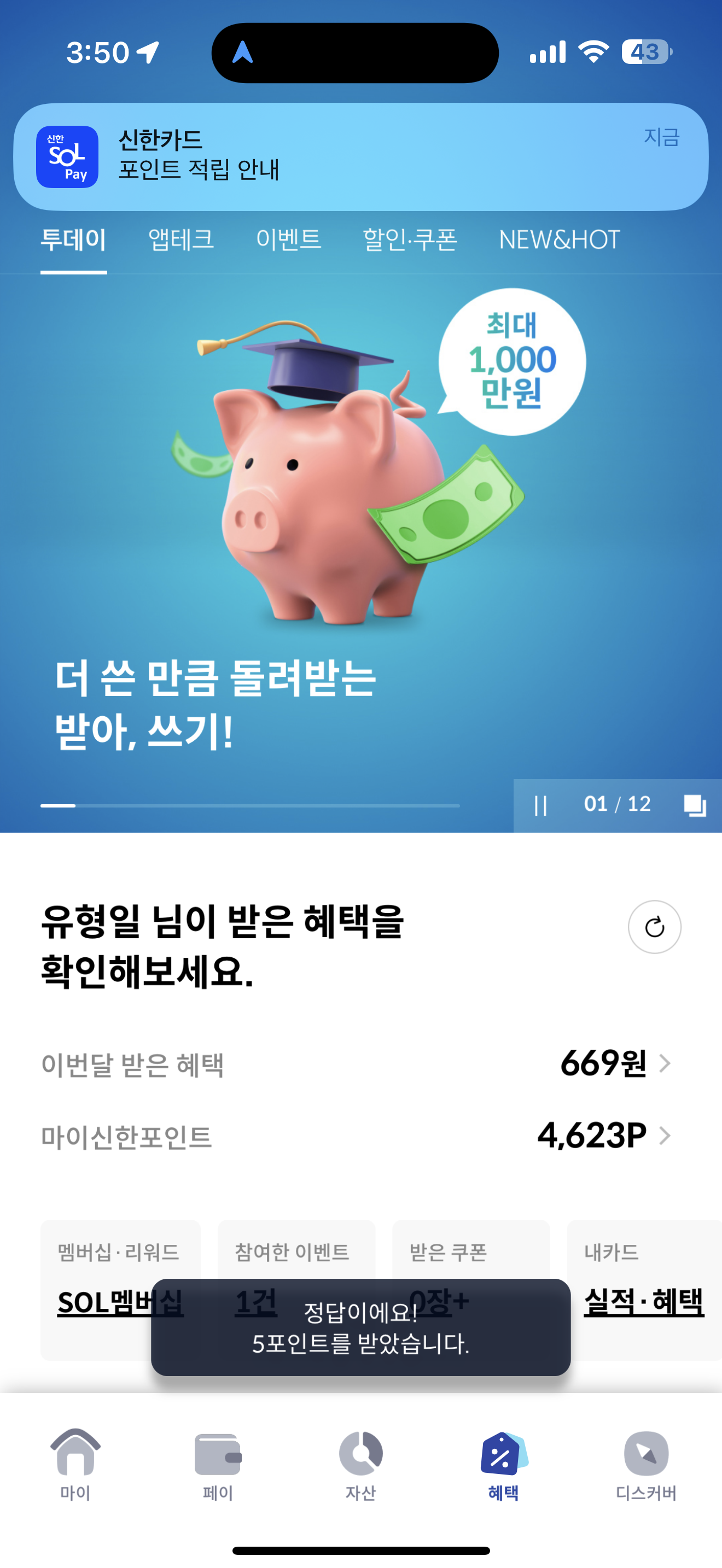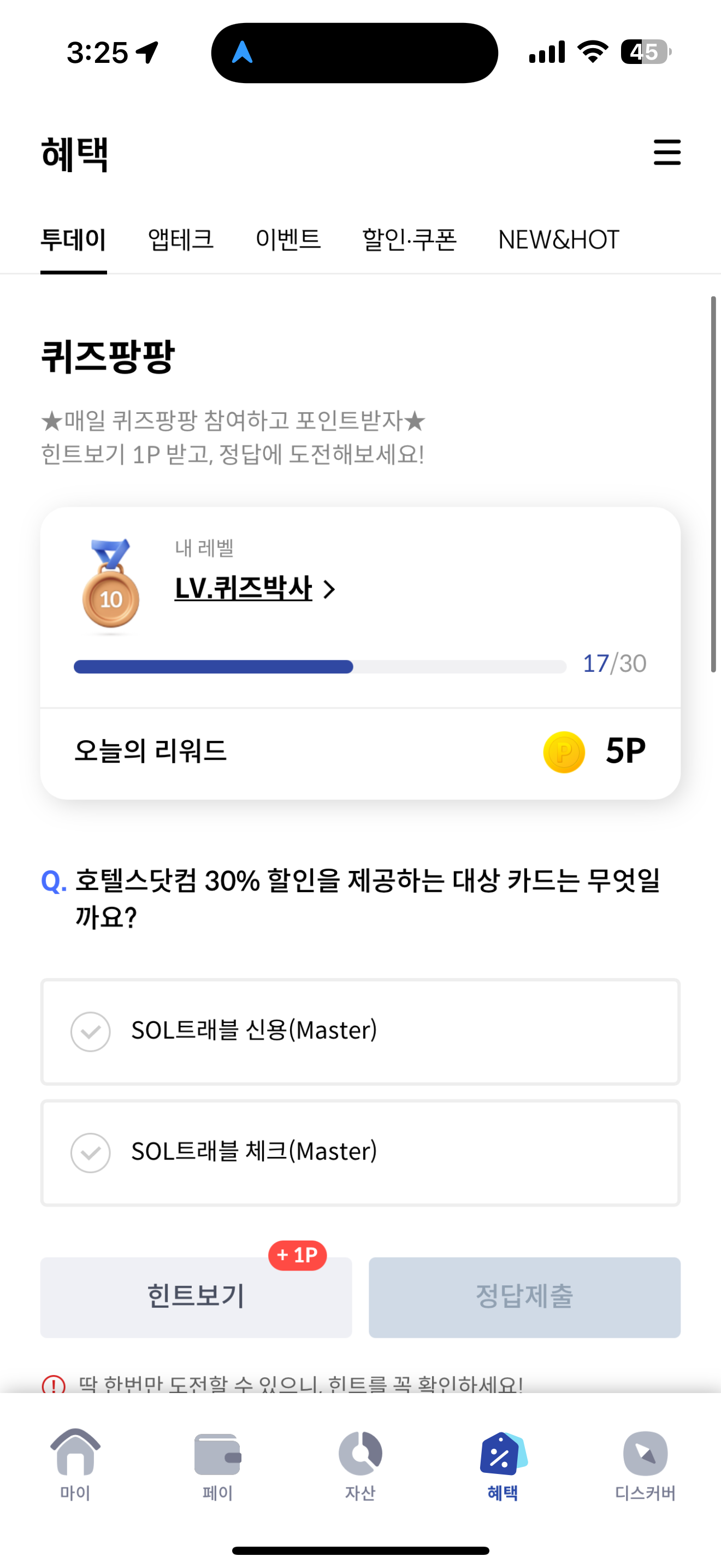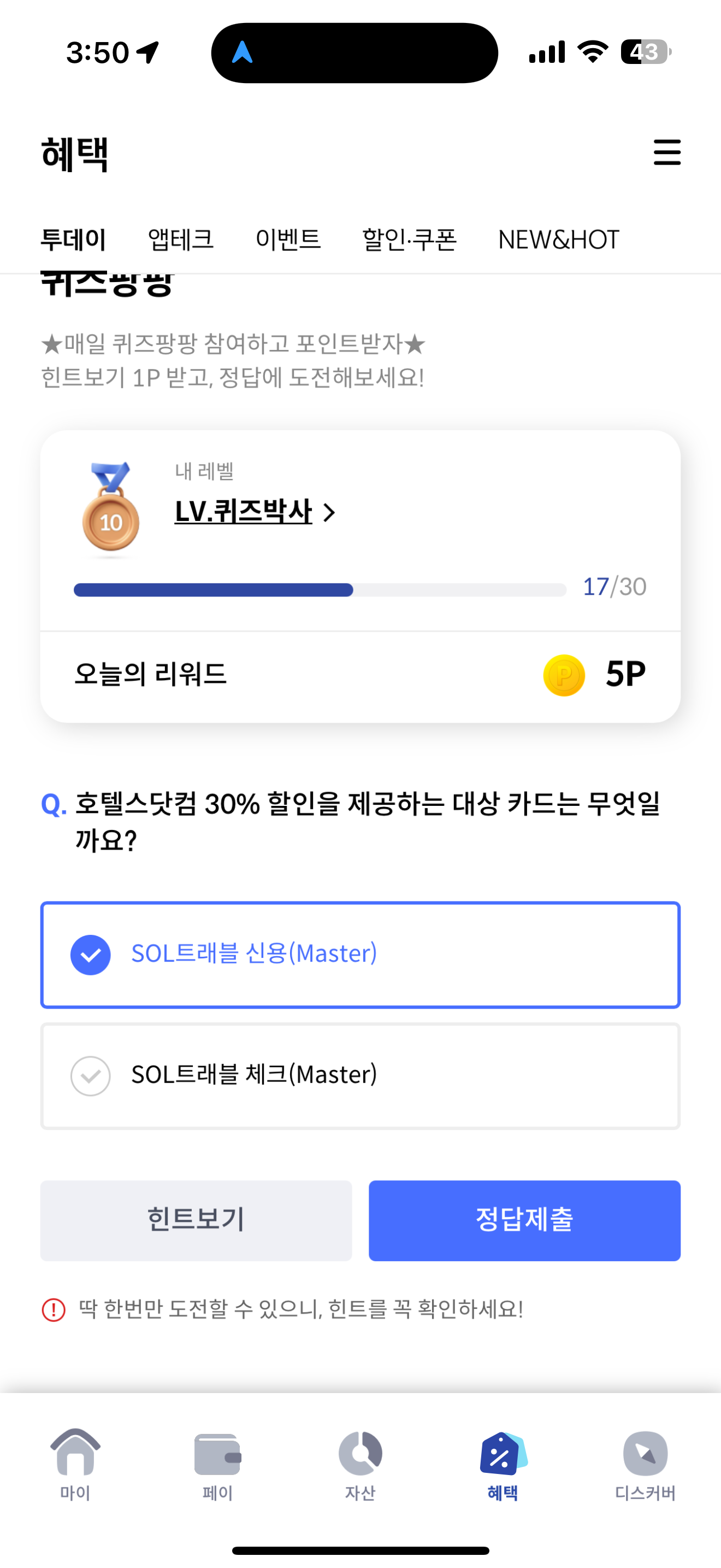 신한카드 퀴즈팡팡 정답은 SOL트래블 신용(Master) 입니다
