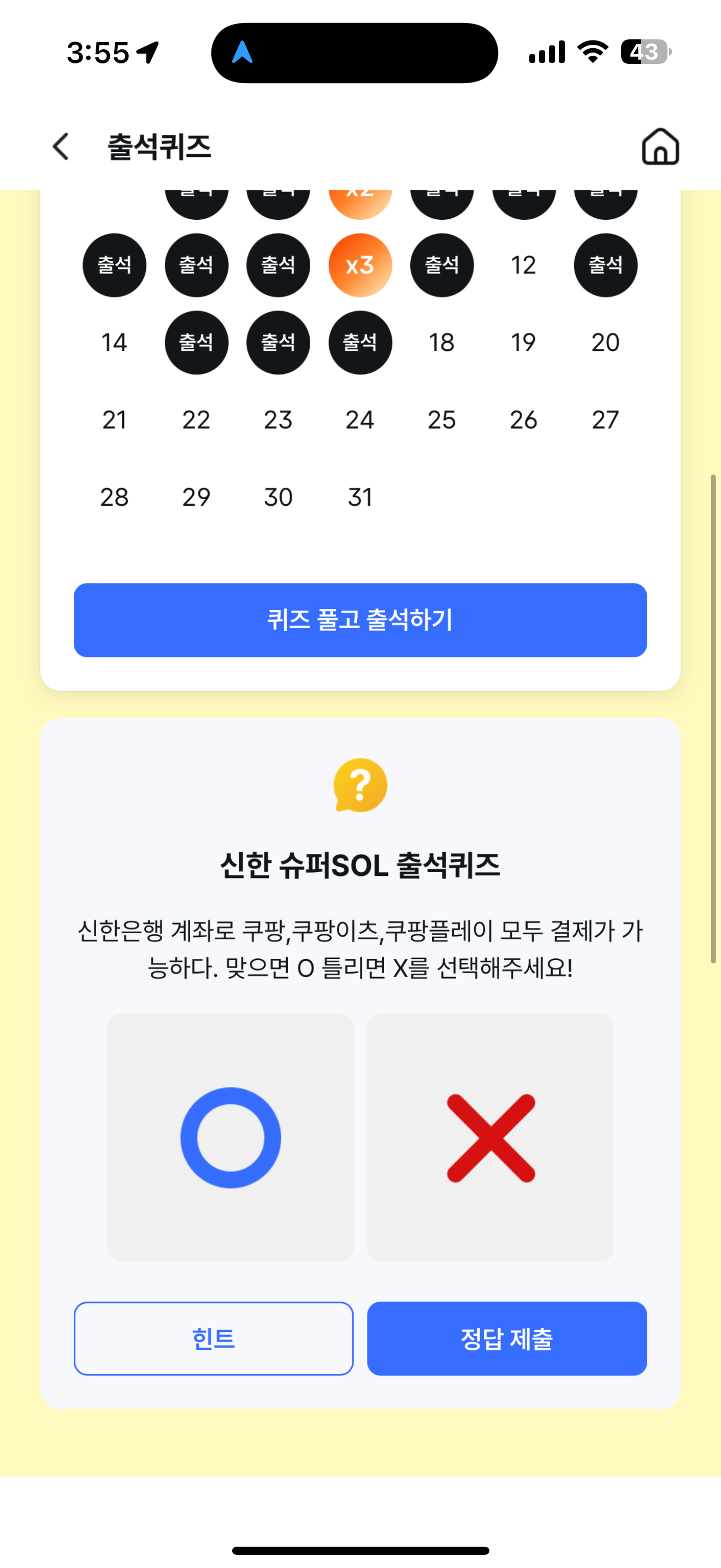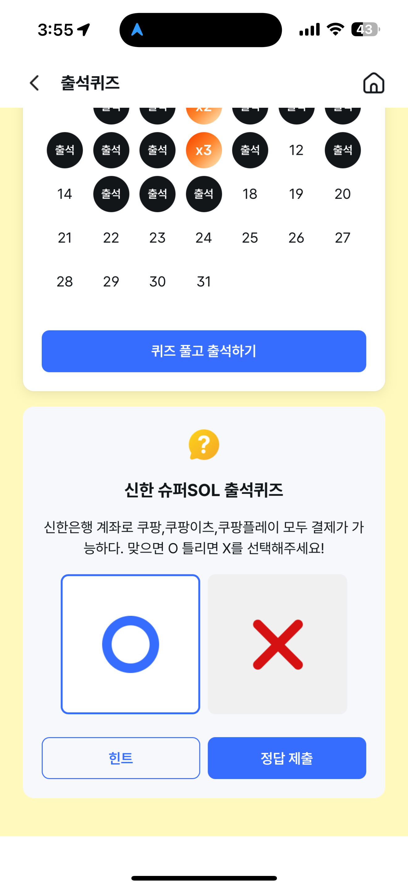 신한 슈퍼SOL 출석퀴즈 정답은 O 입니다