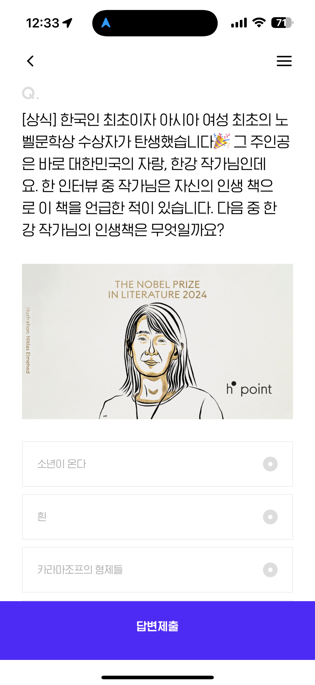 H포인트 퀴즈 10월 19일 정답(한국인 최초이자 아시아 여성 최초의 노벨문학상 수상자가 탄생했습니다 그 주인공은 바로 대한민국의 자랑, 한강 작가님인데요. 한 인터뷰 중 작가님은 자신의 인생 책으로 이 책을 언급한 적이 있습니다)