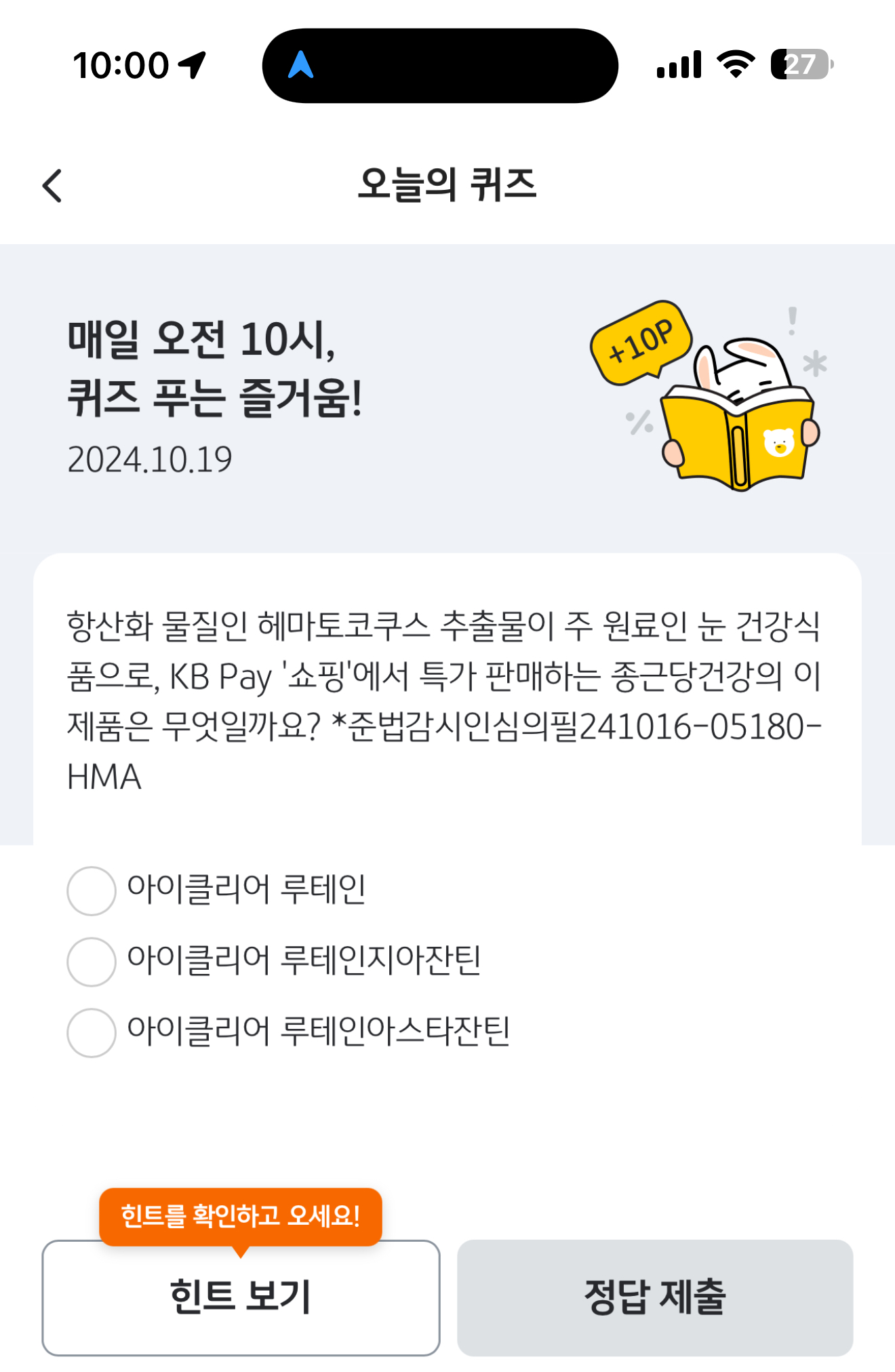 KB Pay 오늘의 퀴즈 10월 19일 정답(항산화 물질인 헤마토코쿠스 추출물이 주 원료인 눈 건강식품으로, KB Pay '쇼핑'에서 특가 판매하는 종근당건강의 이 제품은 무엇일까요?)