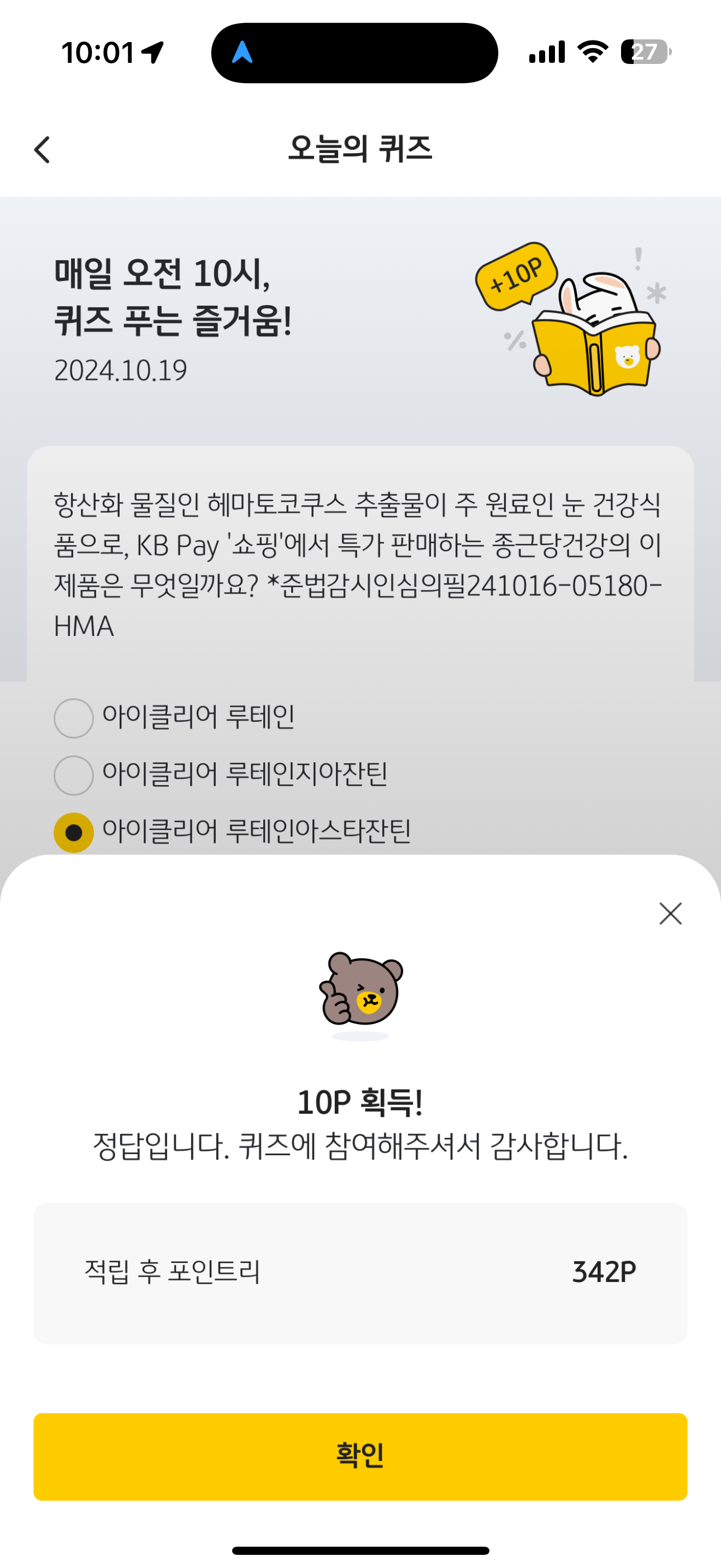 KB Pay 오늘의 퀴즈 정답은 아이클리어 루테인아스타잔틴 입니다.