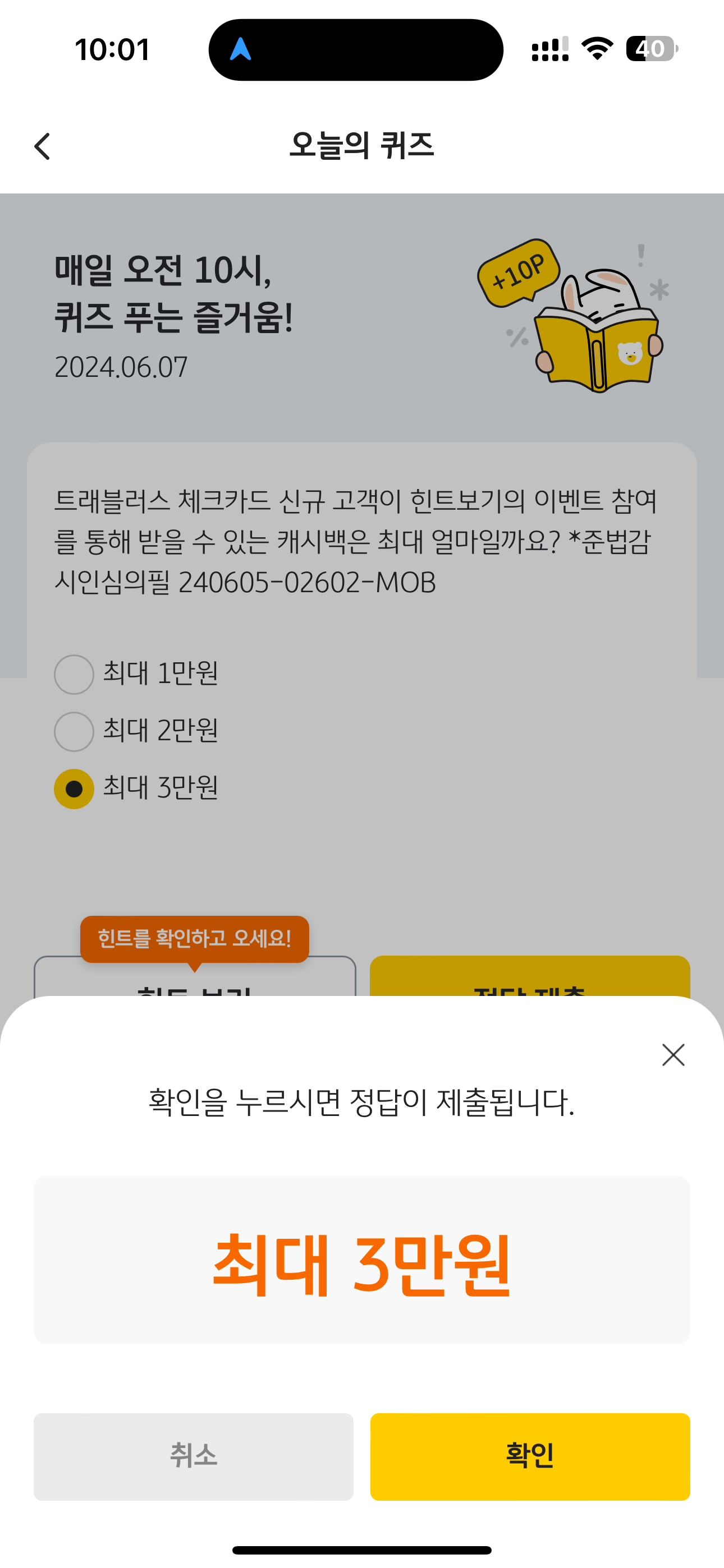 트래블러스 체크카드 신규 고객이 힌트보기의 이벤트 참여를 통해 받을 수 있는 캐시백은 최대 얼마일까요? *준법감시인심의필 240605-02602-MOB 보기는 1. 최대 1만원 2. 최대 2만원 3. 최대 3만원 입니다. 트래블러스 체크카드는 여행 갈때 매력적인 카드이니 잘 확인해 보세요