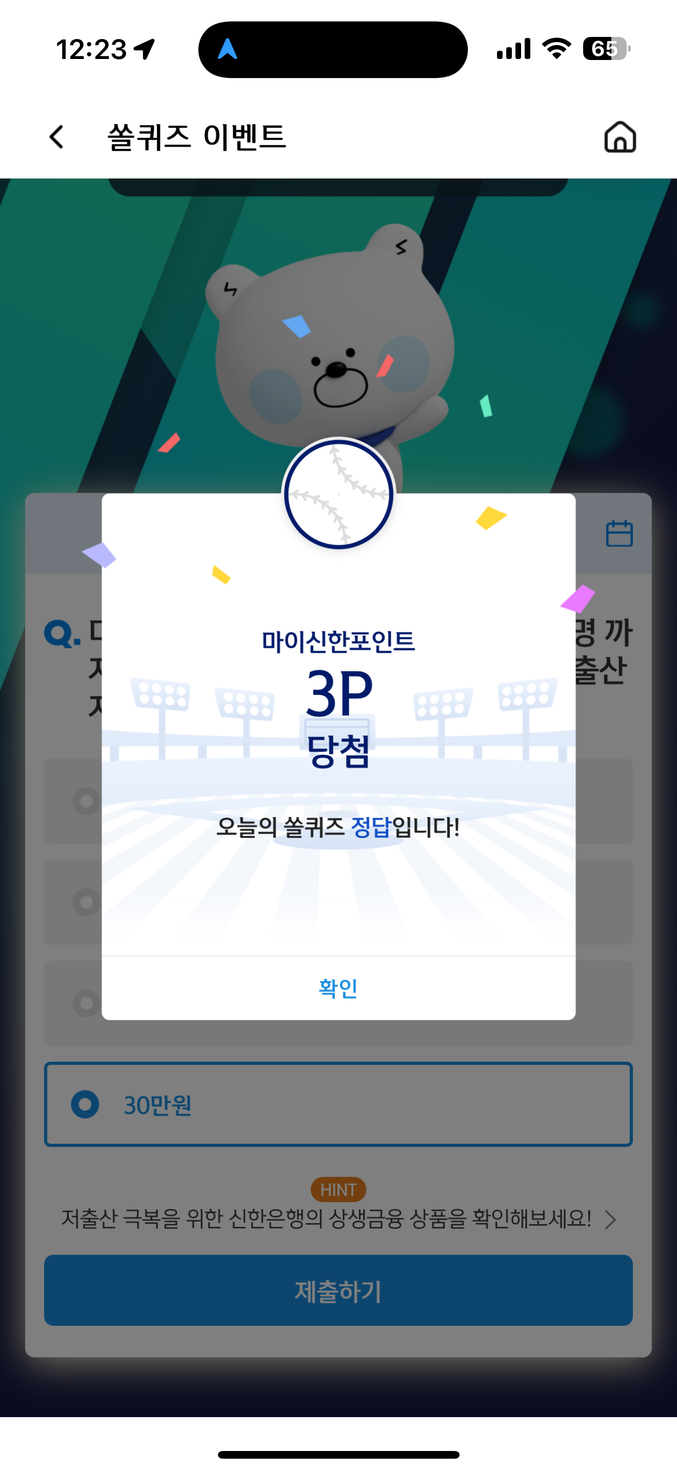 신한 슈퍼SOL 야구/상식 쏠퀴즈 정답은 30만원 입니다