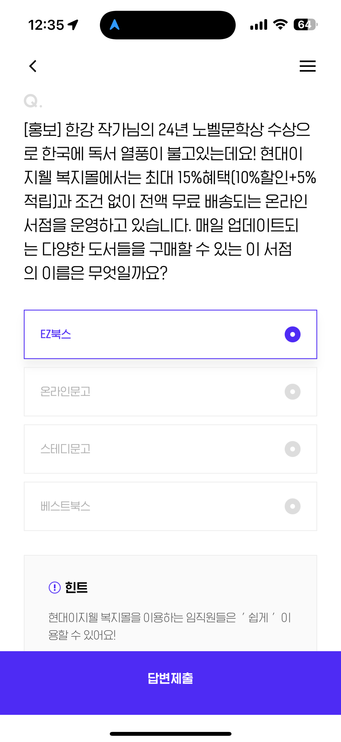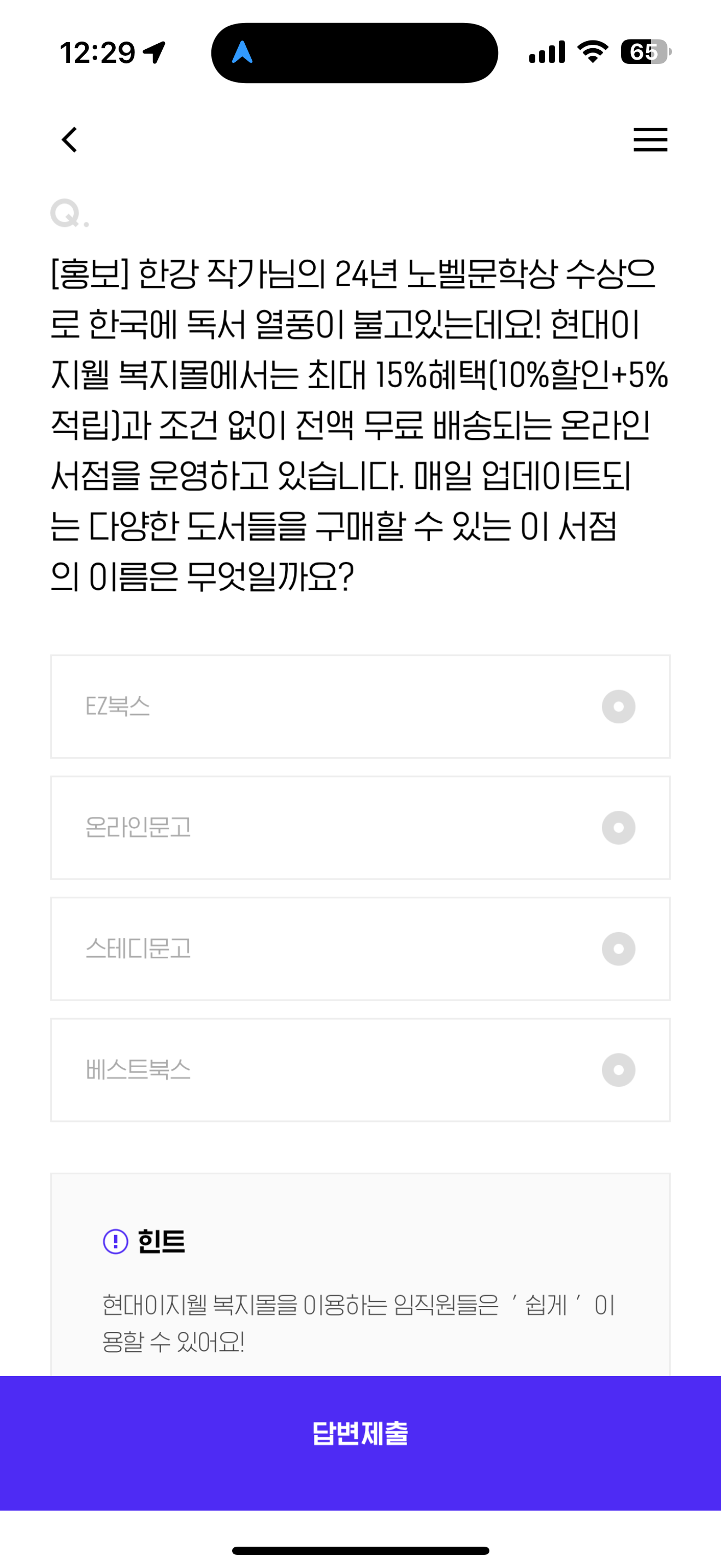 한강 작가님의 24년 노벨문학상 수상으로 한국에 독서 열풍이 불고있는데요! 현대이지웰 복지몰에서는 최대 15%혜택(10%할인+5%적립)과 조건 없이 전액 무료 배송되는 온라인 서점을 운영하고 있습니다. 매일 업데이트되는 다양한 도서들을 구매할 수 있는 이 서점의 이름은 무엇일까요? 보기는 1. EZ북스 2. 온라인문고 3. 스테디문고 4. 베스트북스 입니다.