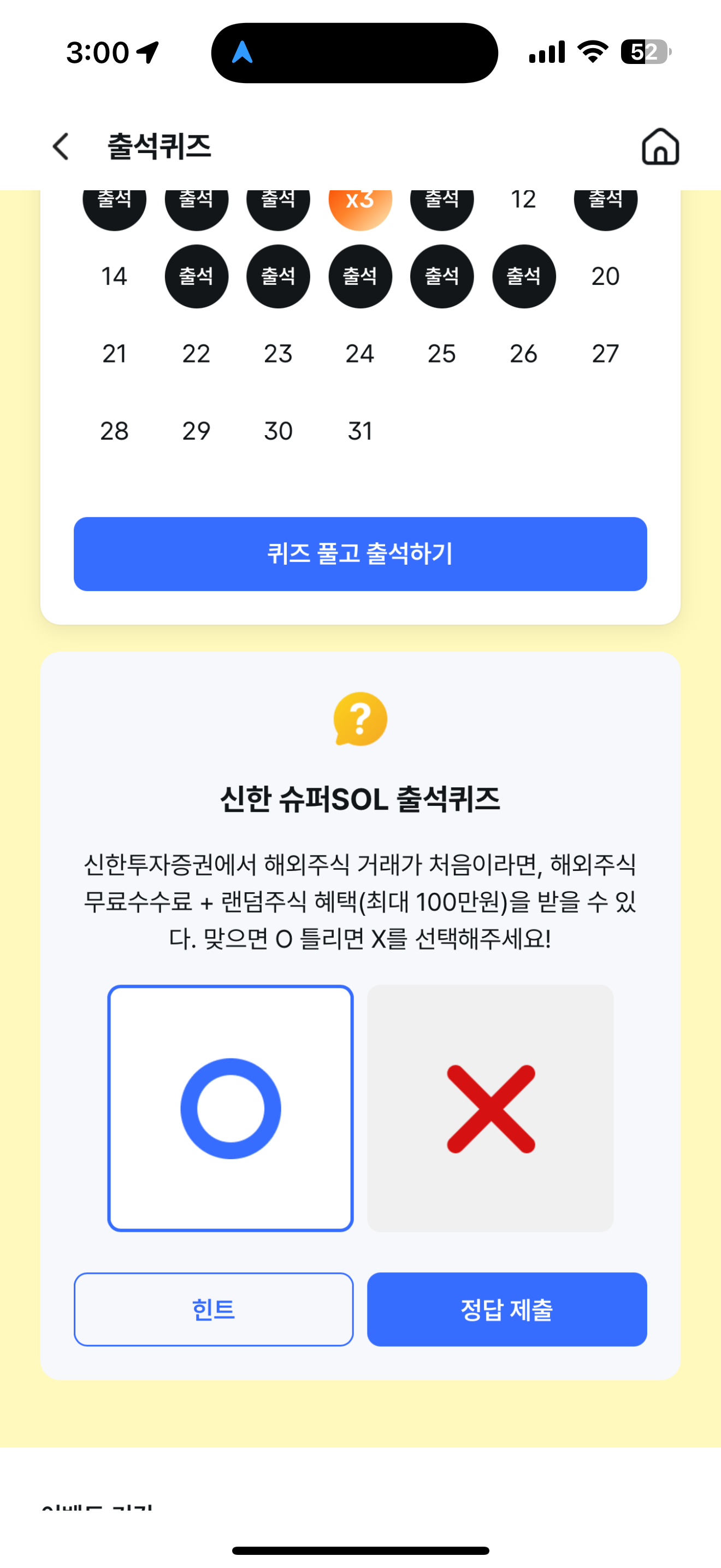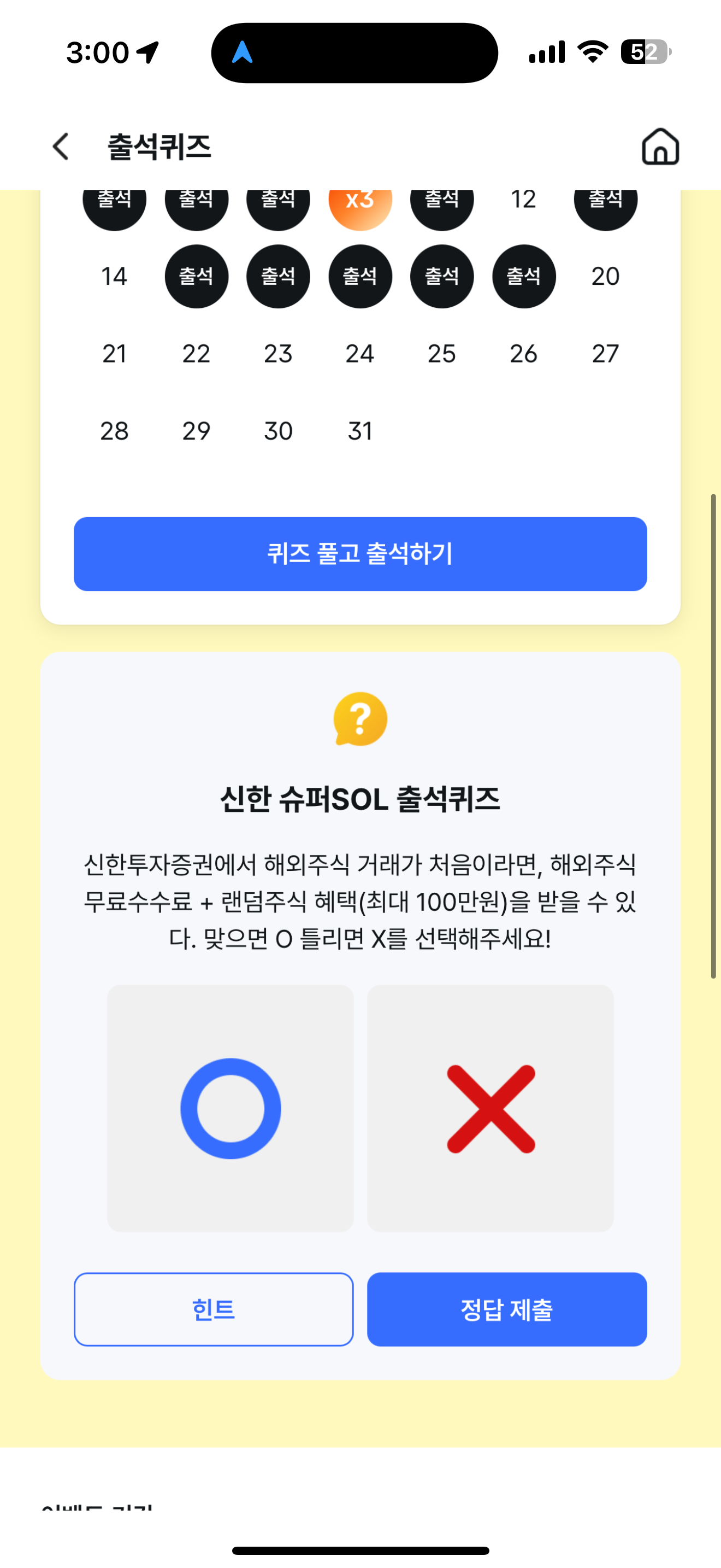 신한 슈퍼SOL 출석퀴즈 정답은 O 입니다