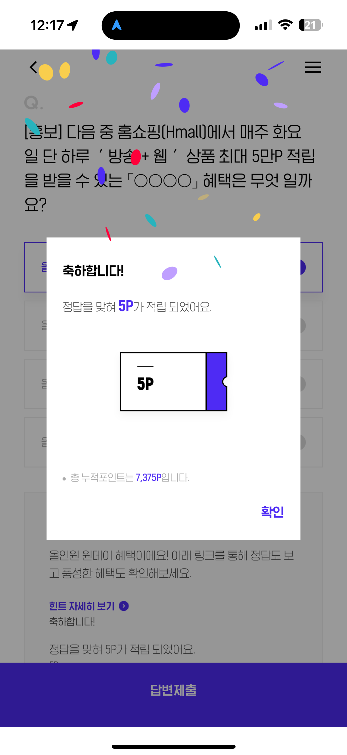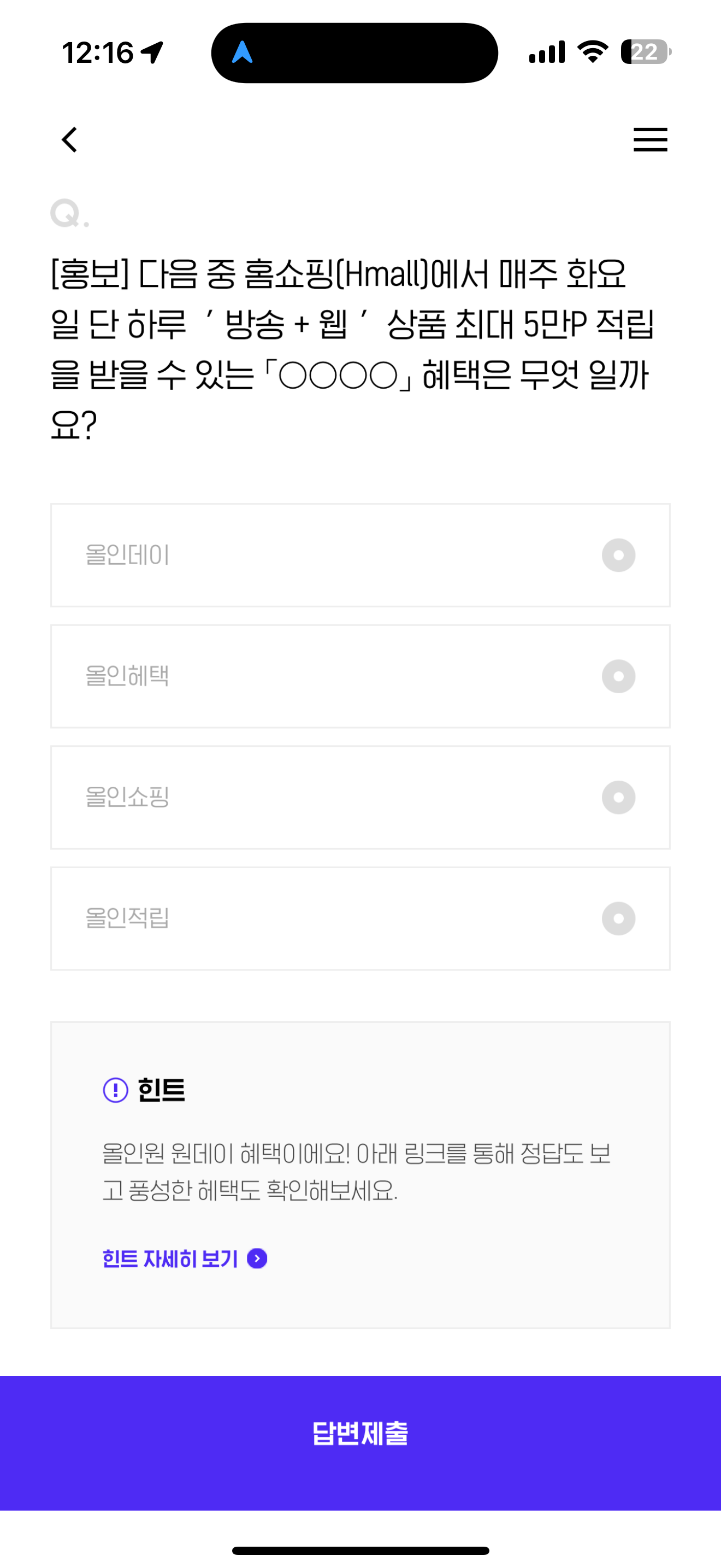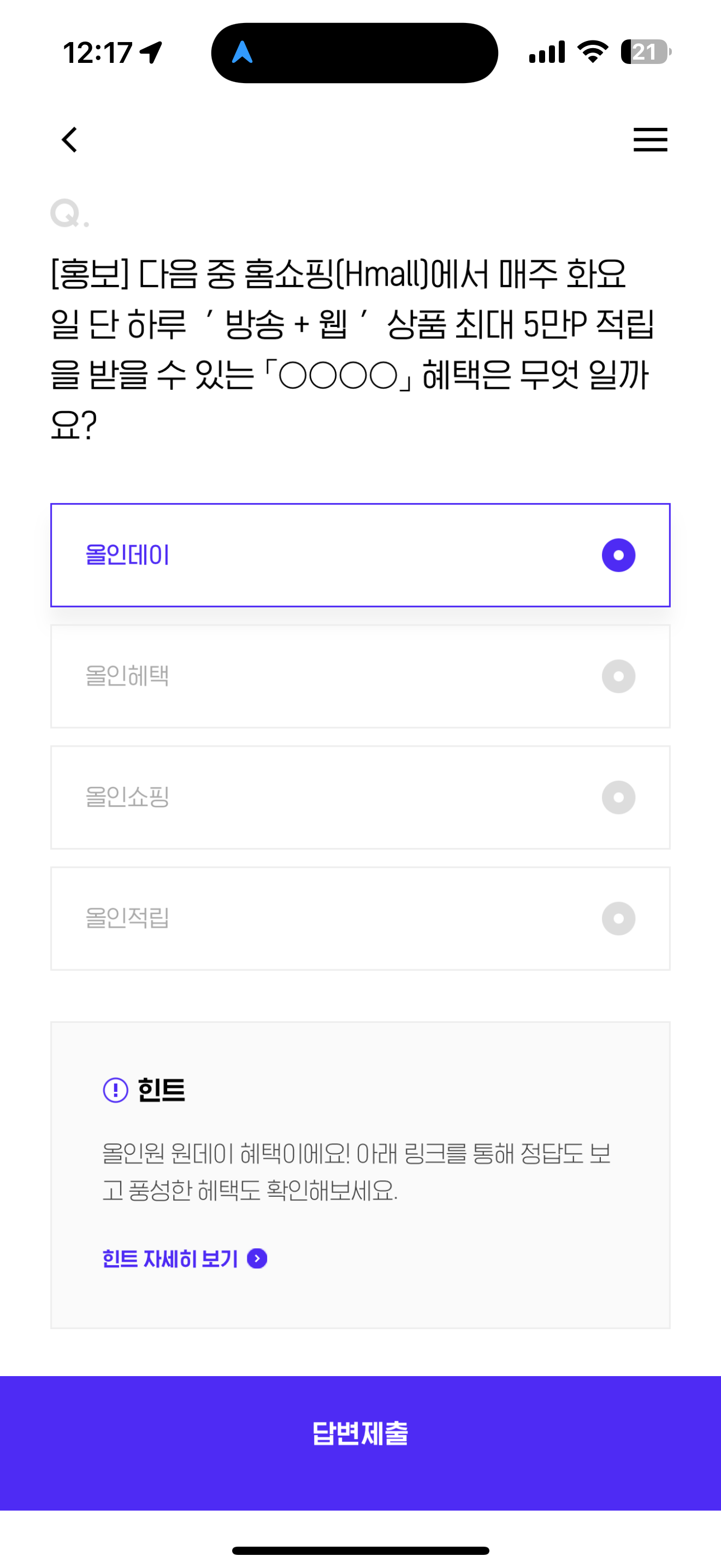 다음 중 홈쇼핑(Hmall)에서 매주 화요일 단 하루 ' 방송 + 웹 ' 상품 최대 5만P 적립을 받을 수 있는 OOOO 혜택은 무엇 일까요? 보기는 1. 올인데이 2. 올인혜택 3. 올인쇼핑 4. 올인적립 입니다. Hmall 홈쇼핑에서 화욜일 단 하루 5만 포인트 적립을 받을 수 있으니 참고해서 활용해 보세요