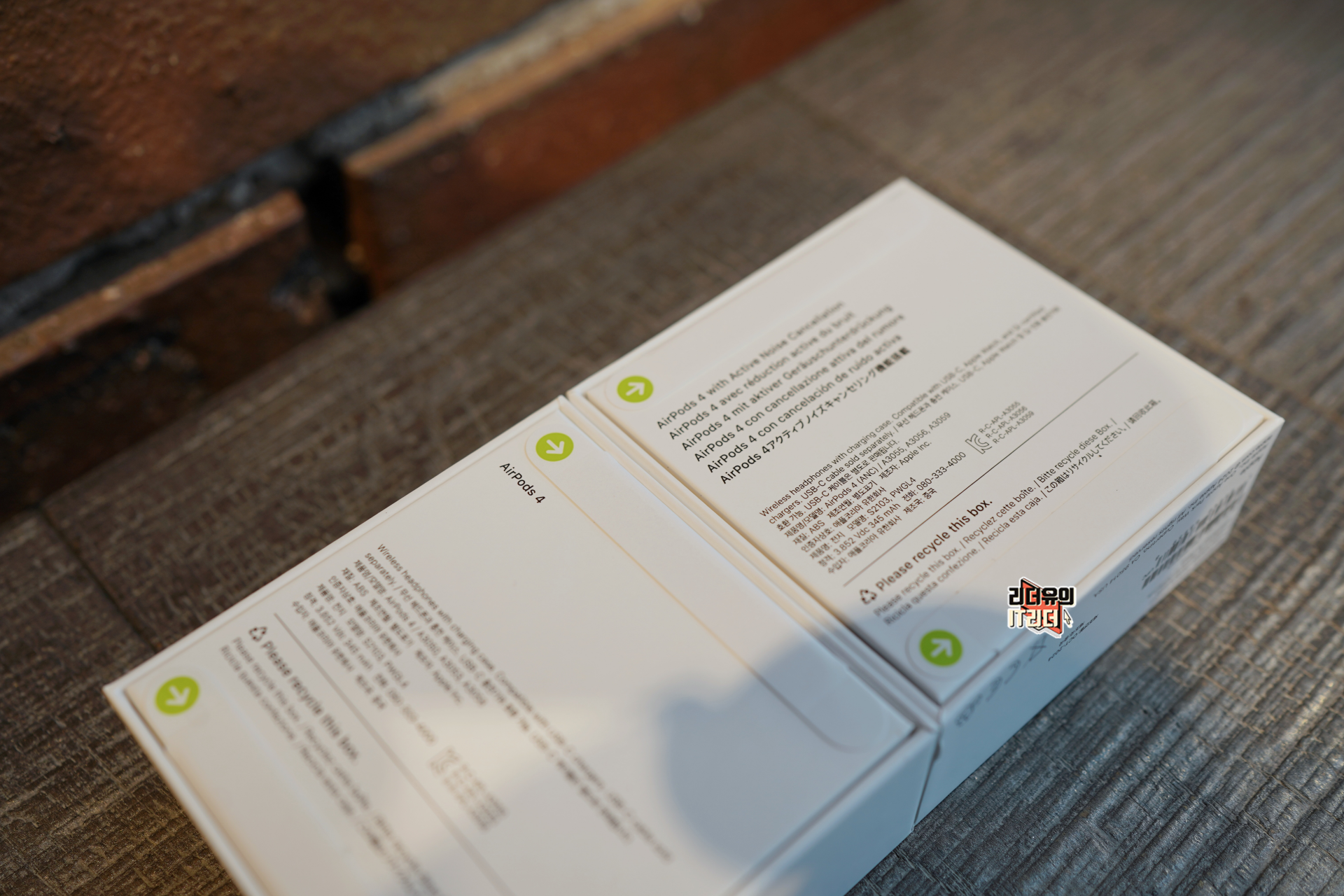 왼쪽이 기본 에어팟4 오른쪽이 에어팟4 액티브 노이즈 캔슬링 모델입니다. 패키지 사이즈는 같지만 새겨진 이미지가 다릅니다. 에어팟4 액티브 노이즈 캔슬링 모델은 지그 재그로 에어팟4 이미지를 넣었습니다.