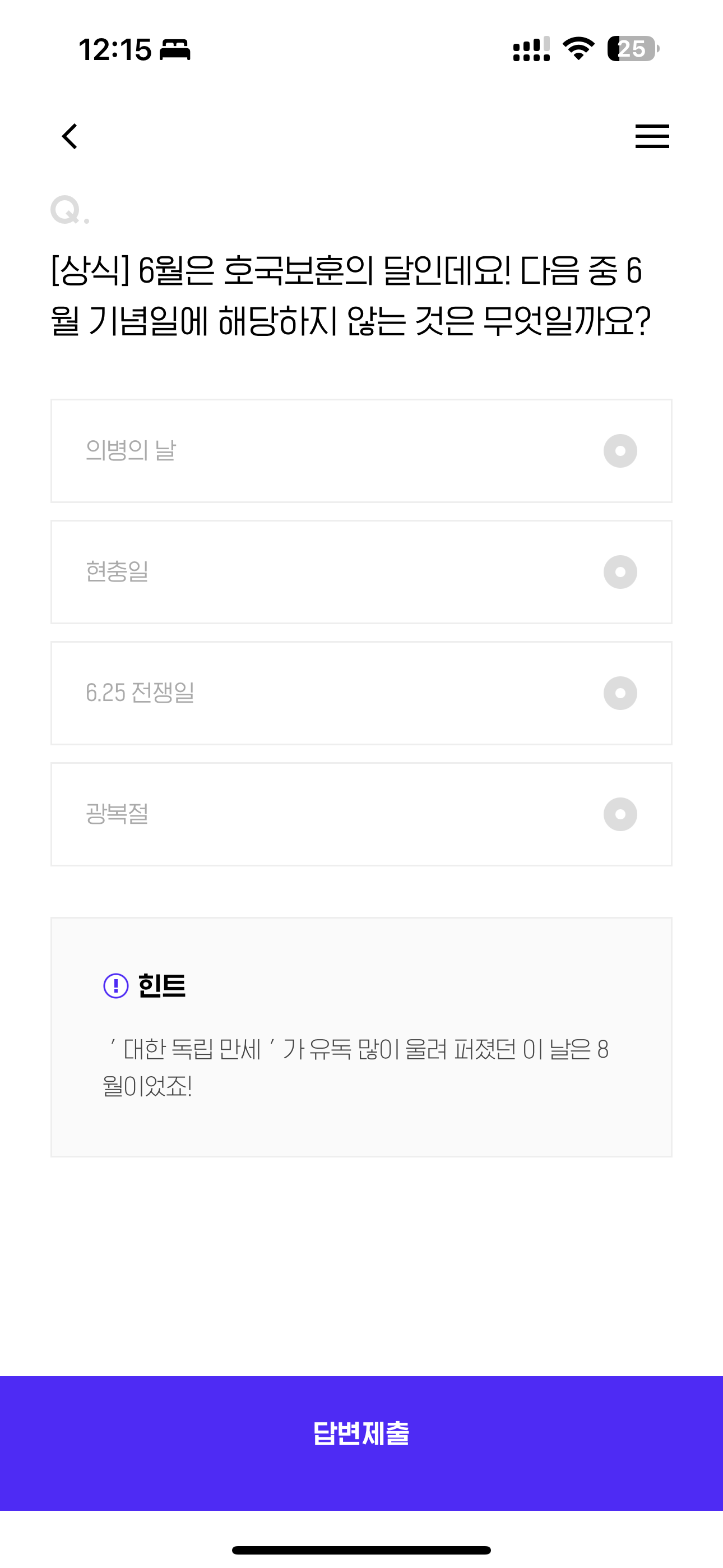 [상식] 6월은 호국보훈의 달인데요! 다음 중 6월 기념일에 해당하지 않는 것은 무엇일까요? 보기는 1. 의병의 날 2. 현충일 3. 6.25 전쟁일 4. 광복절 입니다. 6월은 의미있는 날들이 정말 많은데요. 하나하나 다 우리나라의 역사를 기리는 날들이니 꼭 기억해 두세요