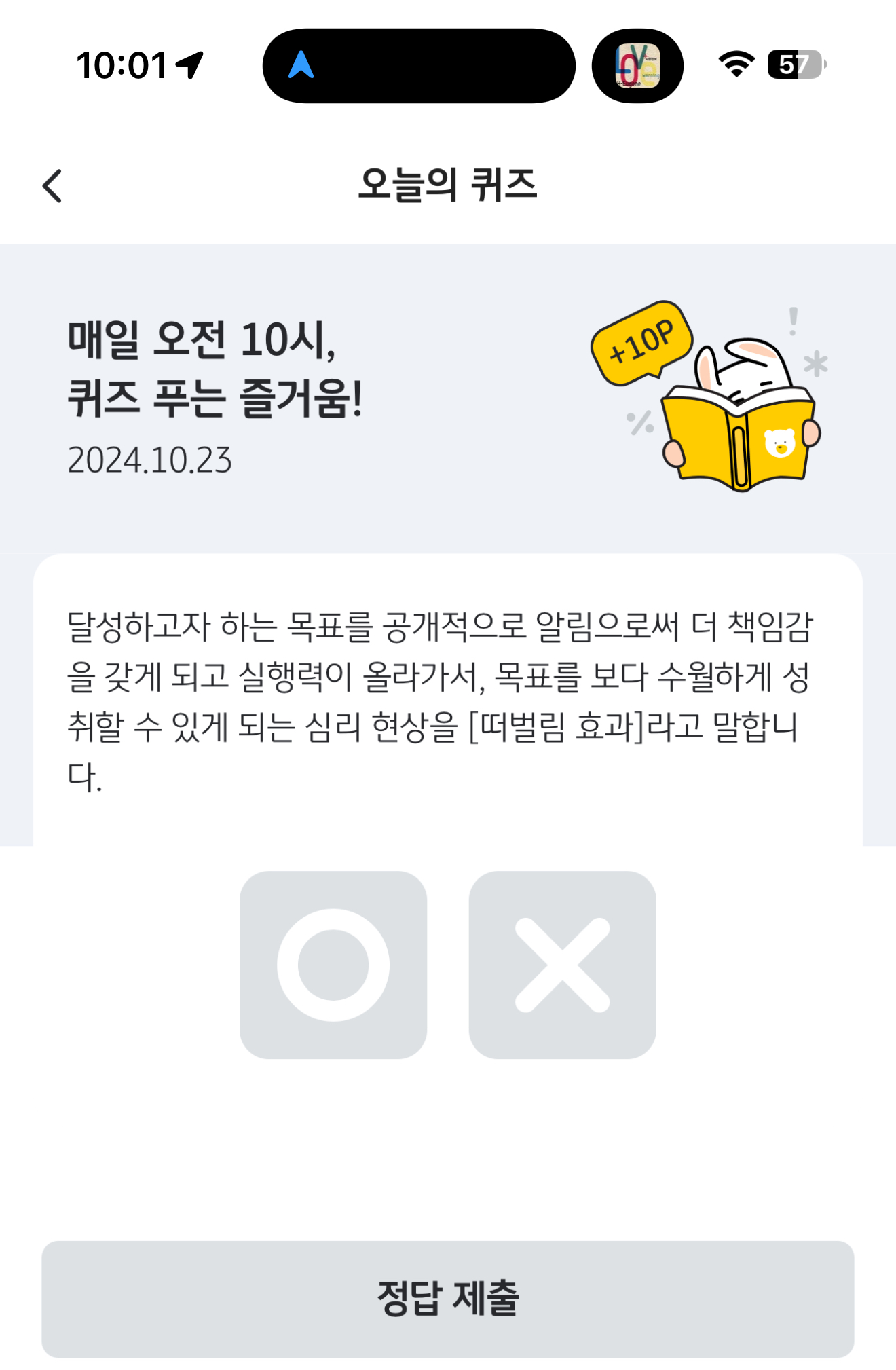 달성하고자 하는 목표를 공개적으로 알림으로써 더 책임감을 갖게 되고 실행력이 올라가서, 목표를 보다 수월하게 성취할 수 있게 되는 심리 현상을 [떠벌림 효과]라고 말합니다 OX 퀴즈인데요