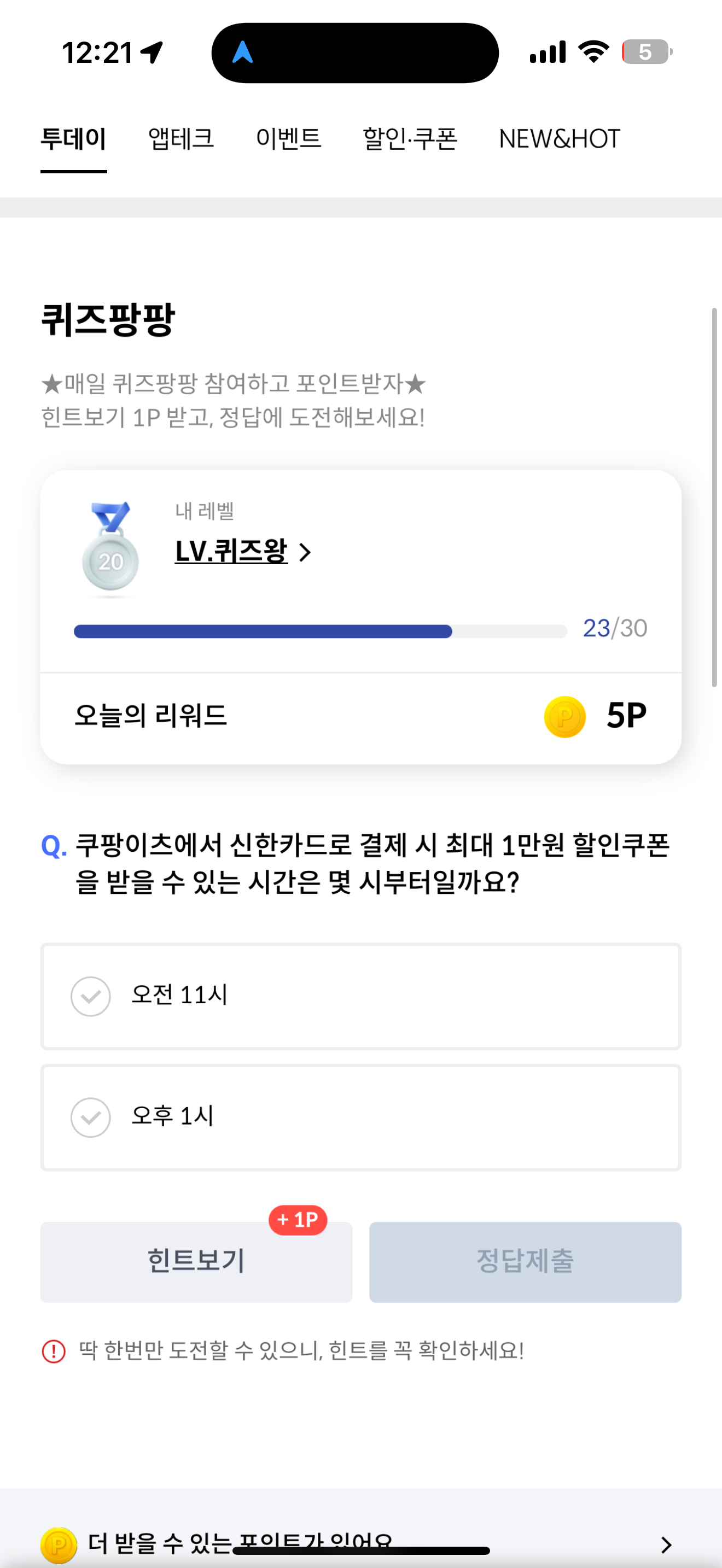 신한카드 퀴즈팡팡 정답은 오전 11시 입니다