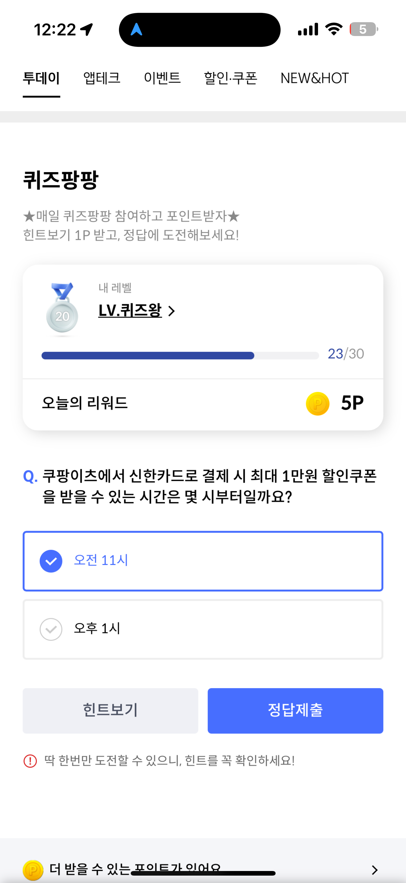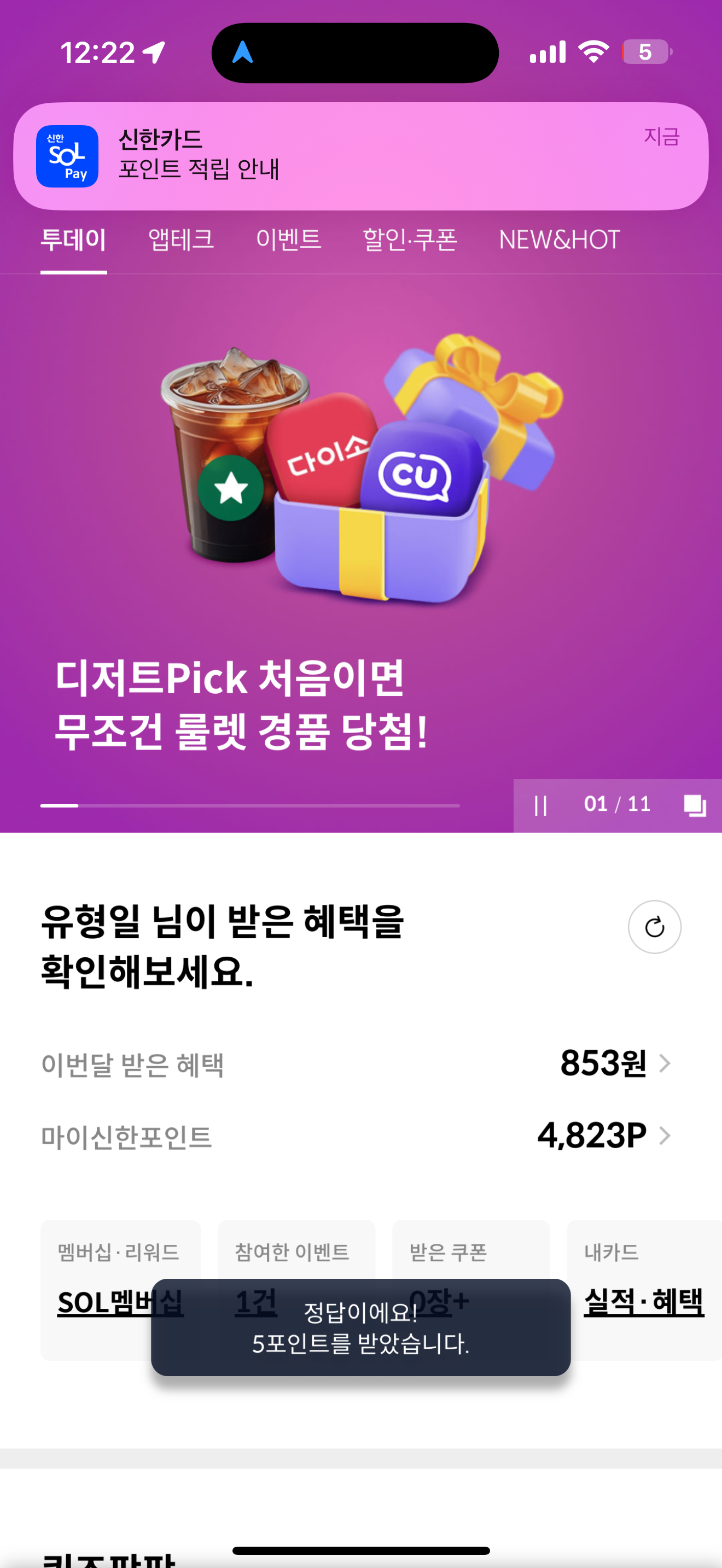 신한카드 퀴즈팡팡 정답은 오전 11시 입니다
