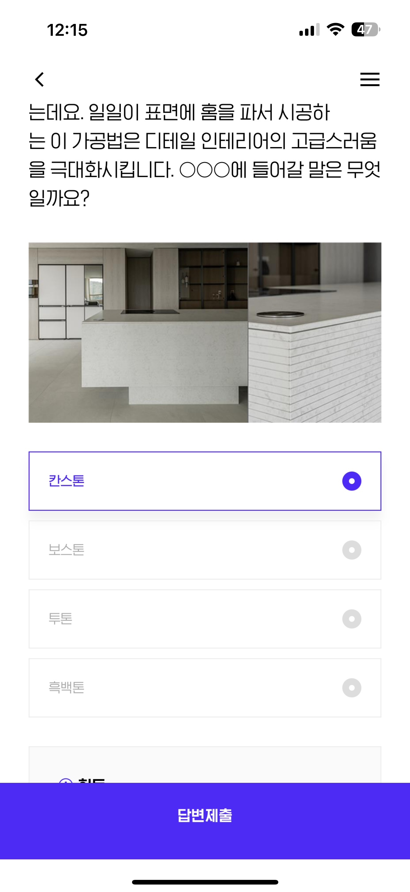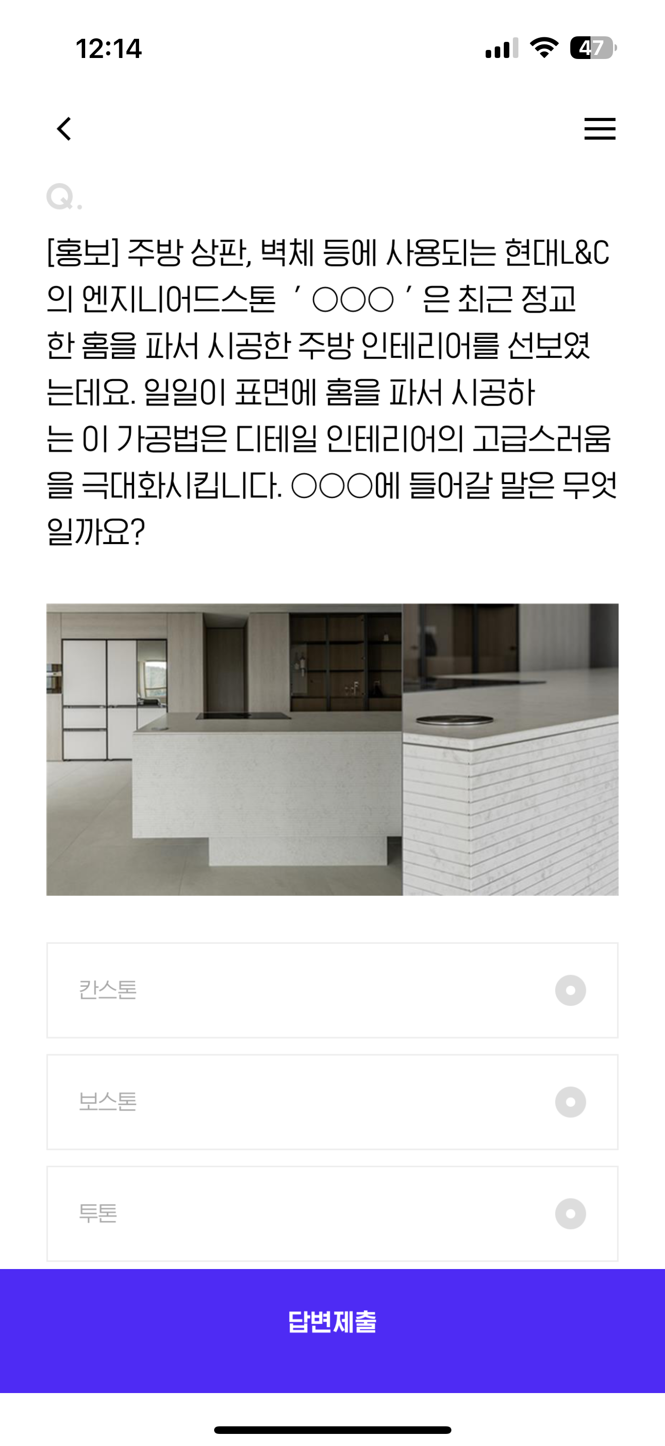 주방 상판, 벽체 등에 사용되는 현대L&C의 엔지니어드스톤 ' OOO ' 은 최근 정교한 홈을 파서 시공한 주방 인테리어를 선보였는데요. 일일이 표면에 홈을 파서 시공하는 이 가공법은 디테일 인테리어의 고급스러움을 극대화시킵니다. OOO에 들어갈 말은 무엇일까요? 보기는 1. 칸스톤 2. 보스톤 3. 투톤 4. 흑백톤 입니다